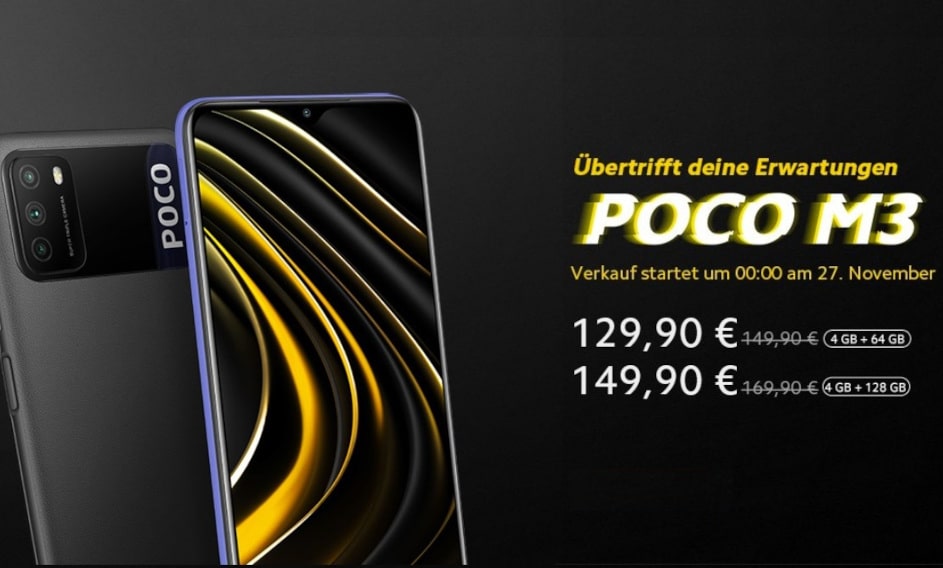 In Deutschland wird das M3 in zwei Versionen angeboten. Die Basisausstattung mit 4 GByte RAM und 64 GByte Speicher kostet regulär 149 Euro, vom 27. November bis zum 30. November 2020 ist das Smartphone im Poco Onlineshop für 129 Euro erhältlich. Das Modell mit 4 GByte RAM und 128 GByte Speicher kostet regulär 169 Euro, während des Flashsales ist es für 149 Euro erhältlich. Offiziell startet der Verkauf in Deutschland laut Poco am 2. Dezember.