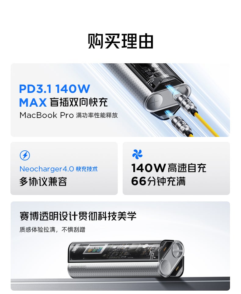 Die neue RedMagic Powerbank bietet eine beeindruckende Leistung von bis zu 165 Watt, was sie besonders für Gamer mit leistungsstarken Gaming-Smartphones prädestiniert. Mit USB-C lassen sich beispielsweise MacBook Pros in nur einer Stunde zur Hälfte aufladen. Neben den beiden USB-C-Anschlüssen mit hoher Ausgangsleistung (140 und 165 Watt) bietet der USB-A-Anschluss bis zu 33 Watt. Die kombinierte Nutzung mehrerer Anschlüsse ist jedoch leistungslimitiert.