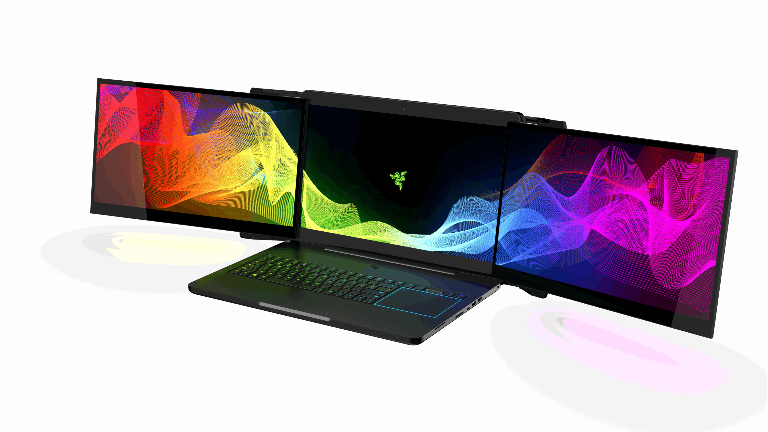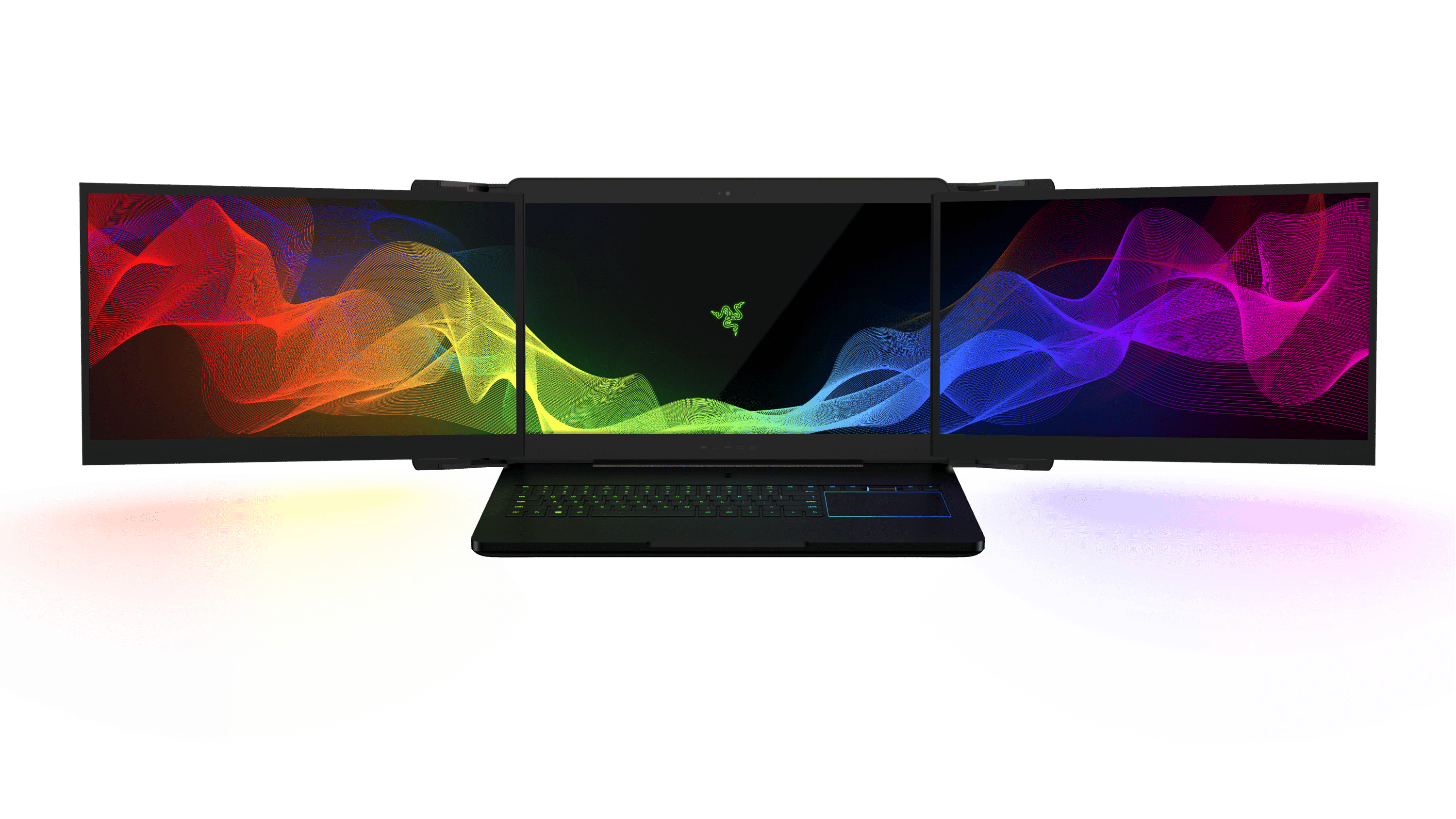 In dem Unibody-CNC-Aluminium-Gehäuse im Razer-Design verbirgt sich kein üblicher Gaming-Laptop, auch wenn eine NVIDIA GeForce GTX 1080 natürlich auch nicht fehlt. Der Hingucker des Projekts sind jedoch die drei 17-Zoll 4K IGZO-Displays mit NVIDIA G-SYNC. Insgesamt bieten diese eine Auflösung von 11.520 x 2.160 Pixel und bilden den kompletten Adobe RGB-Farbraum ab. Zusätzliche Kabel sind für die Nutzung nicht notwendig, denn die Monitore fahren mit einer Ausfahr-Mechanik automatisch aus und sind direkt nutzbar.