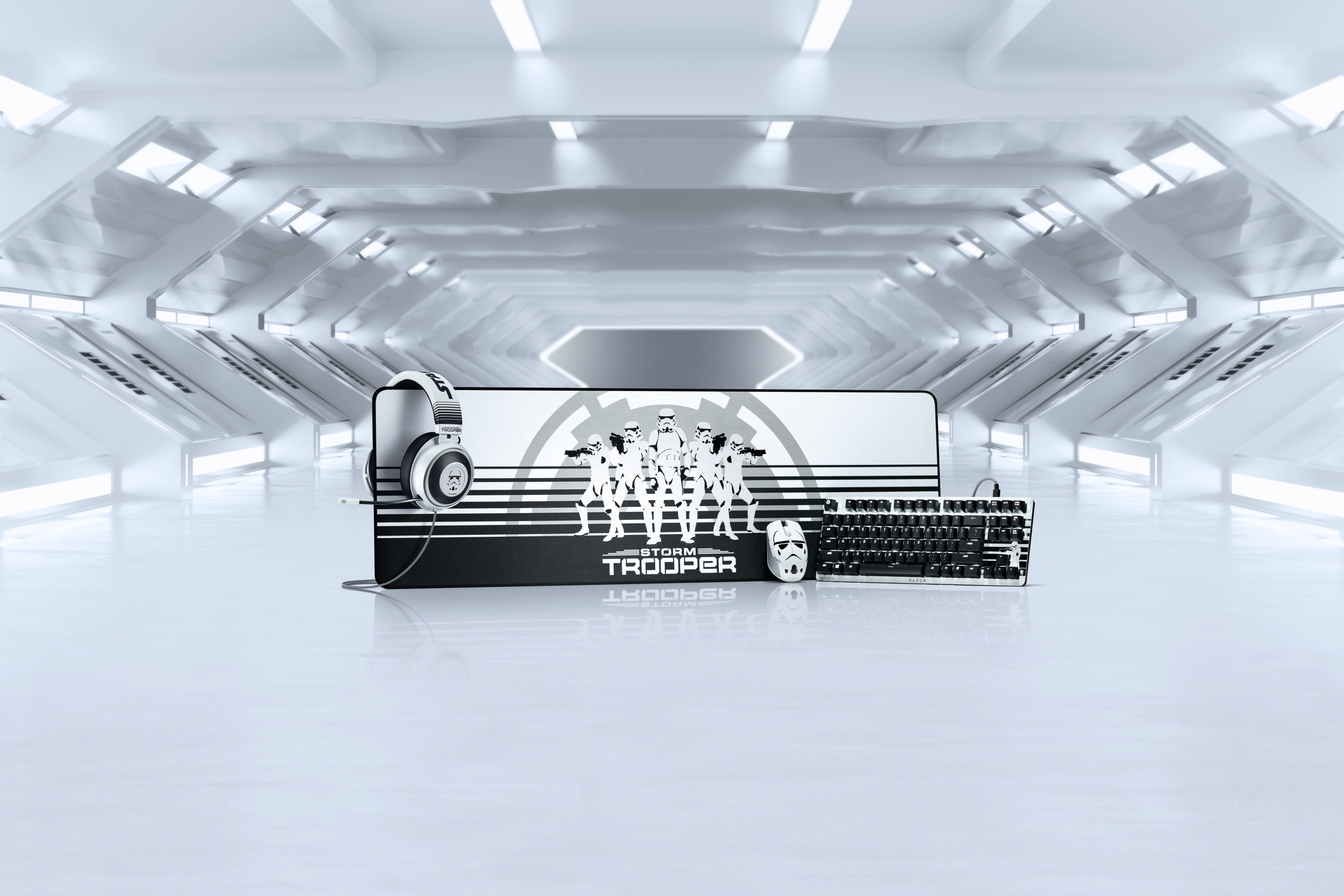 Die vier Geräte haben nicht nur ein weißes Design verpasst bekommen, sondern tragen auch die namengebenden Figuren auf der Brust. Auf der Maus prangt der Stormtropper-Helm und auf dem Mauspad finden sich gleich fünf von Darth Vaders Anhängern. Jedes Geräte wurde liebevoll mit den dunklen Mächten der am meist gefürchteten Armee in der Star Wars-Galaxie verziert.