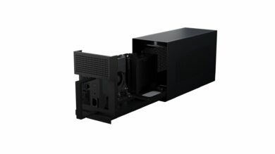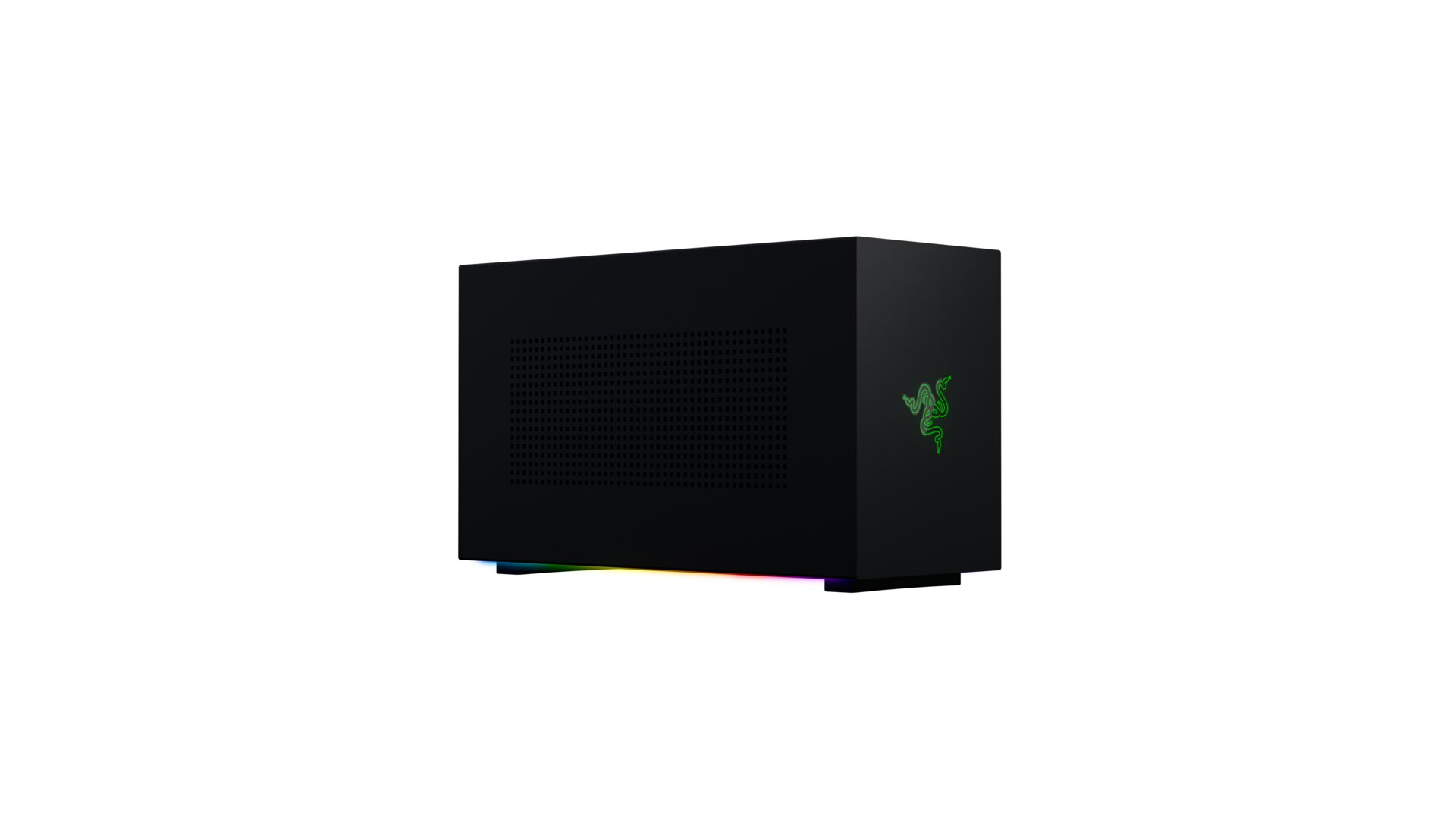 Die Maße des Tomahawk sind wirklich erstaunlich. So kommt es in einer Größe von 210 mm x 150 mm x 365 mm daher. Insgesamt hat das kleine SFF-Gehäuse ein Volumen von 11,5 Liter. Aufgrund des kleinen Designs erinnert das Tomahawk an die PC-Systeme von Razer, welche in einem eGPU-Gehäuse daherkamen. Selbstverständlich wird die RGB-Beleuchtung auch mit Razers hauseigenem System Chroma kommunizieren können. Damit soll man die Beleuchtung bequem steuern können. Trotz kompakter Größe kann man im Tomahawk auch große Grafikkarten unterbringen. Doch das ist kein Muss. So können auch diskrete Grafikkarten verbaut werden. Man soll das Gehäuse wahlweise aber auch ohne Grafikkarte kaufen können. Dabei sind dann auch die PCIe-Slots leer. So soll man das Tomahawk auch mit einer eigenen Grafikkarte ausstatten können.