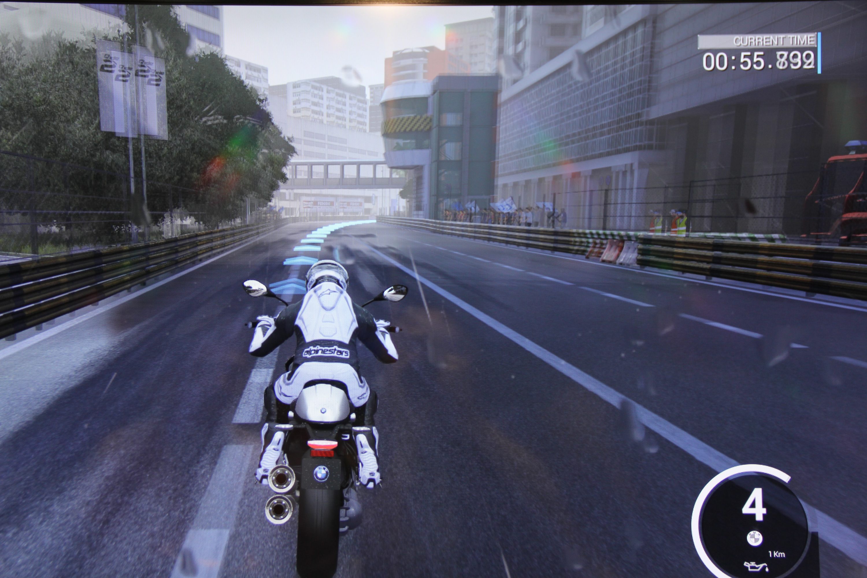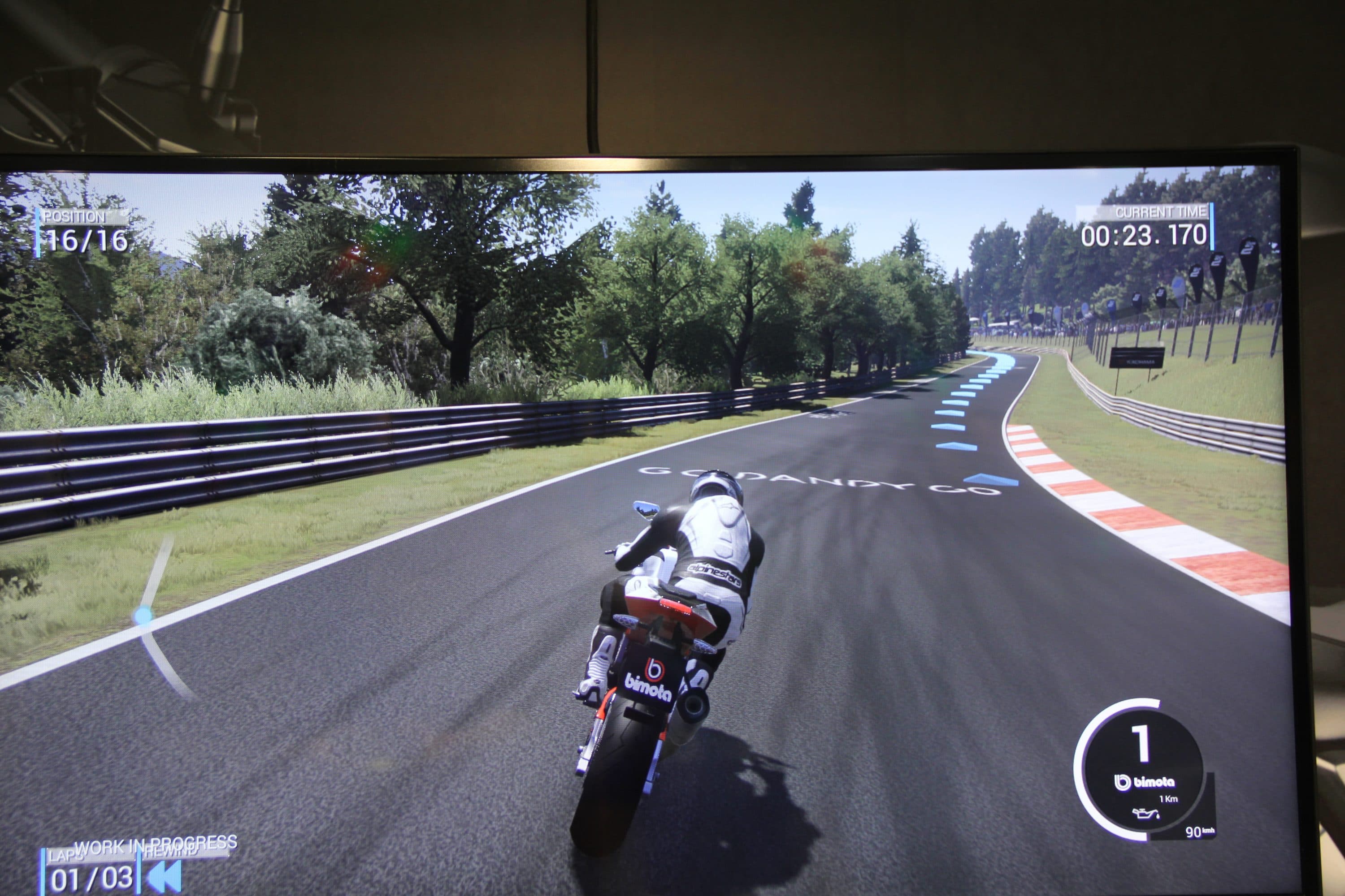 Der „Zeitzurückspuhlmodus“ ist origineller als ein bloßer Wiedereinstieg des Fahrzeugs nach einem Crash. Aber auch das kostet Zeit, man sollte versuchen, den Fahrer unbeschadet das Rennen überstehen zu lassen. Nach wenigen Runden hat man sich schon mit der Steuerung angefreundet. Die klassische Rennspielsteuerung wird um ein Lehnen in die Kurven und die Drehung des Bikes erweitert, was im professionelleren Modus den entscheidenden Unterschied macht.