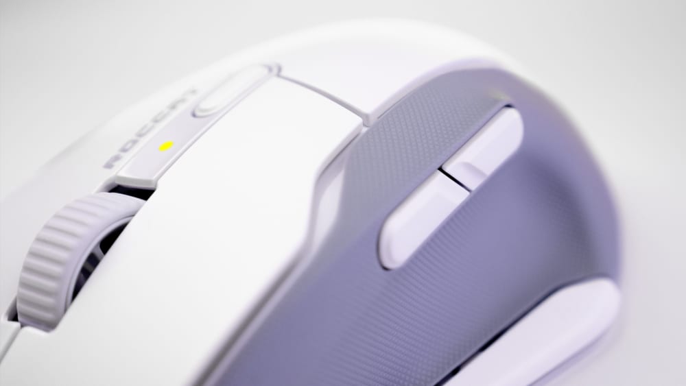 Doch die ROCCAT Kone Air hat noch mehr zu bieten als nur eine lange Laufzeit. Die ergonomisch für Rechtshänder geformte Maus bietet eine Ablage für die Handfläche und seitliche Griffe aus doppelt gespritztem Gummi.