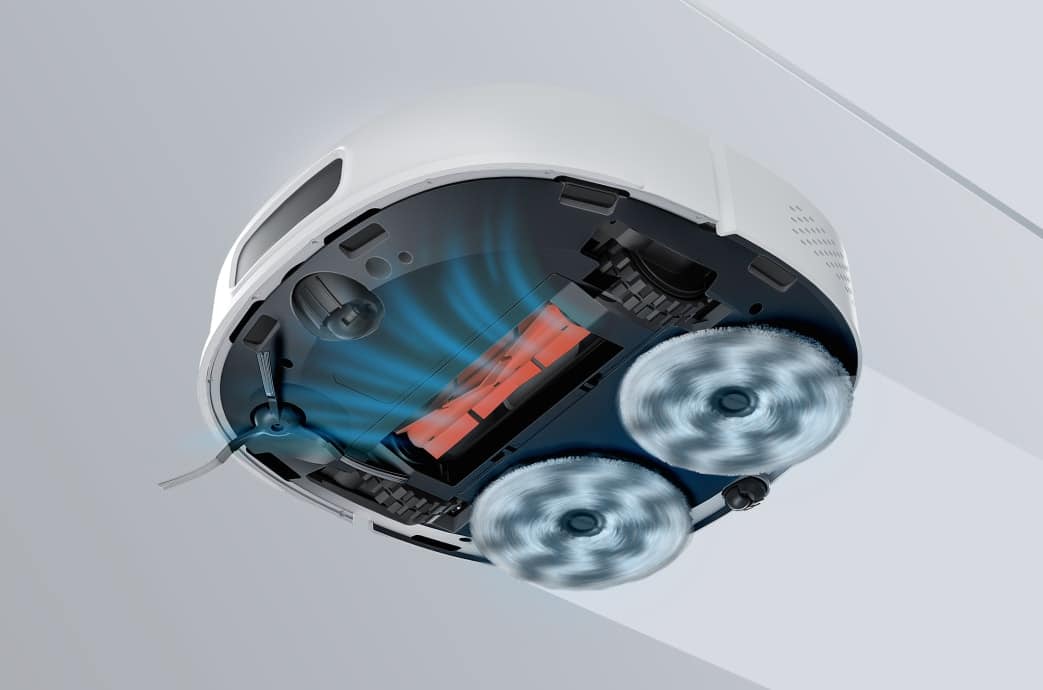 Ausgestattet ist der Saugroboter mit zwei rotierenden Mopp-Pads, die in der beiliegenden Basisstation automatisch gereinigt und getrocknet werden. Gleichzeitig wird in der Station auch der vier Liter fassende Wassertank bei Verwendung der Wischfunktion befüllt, sowie der Schmutzbehälter beim Saugen entleert.