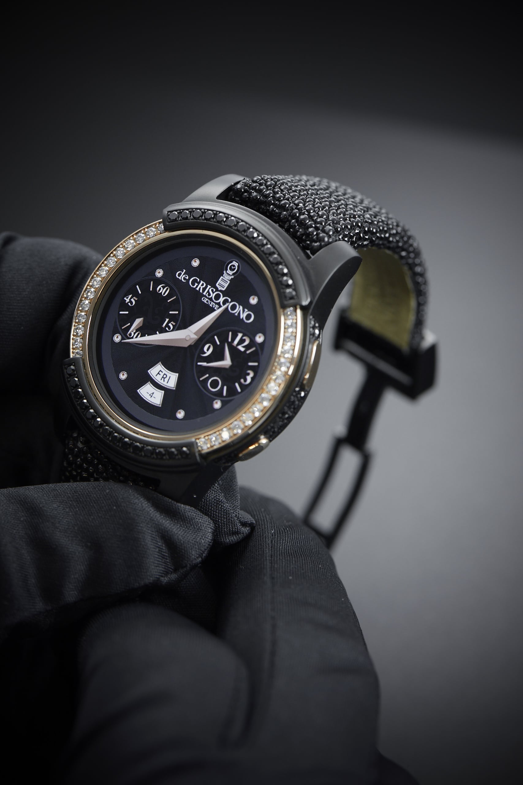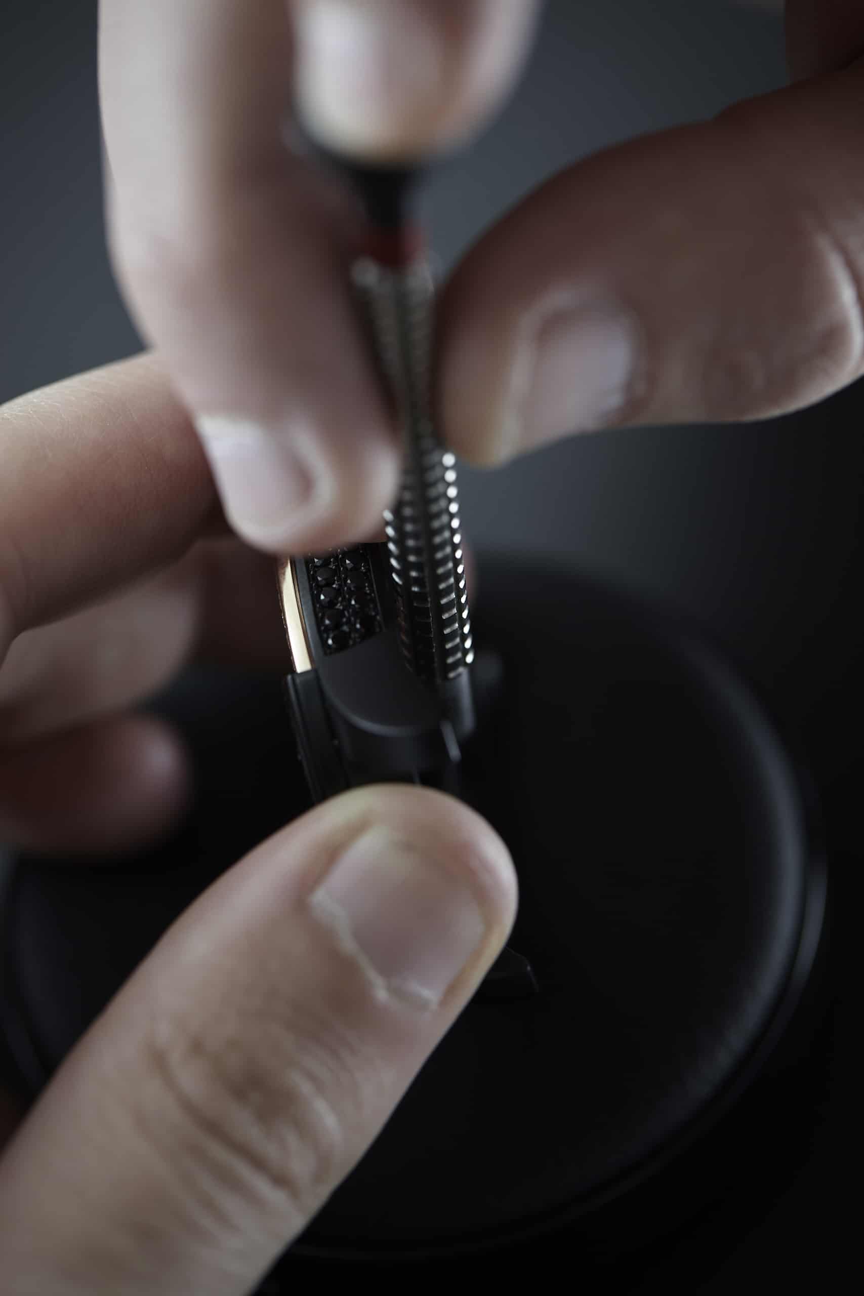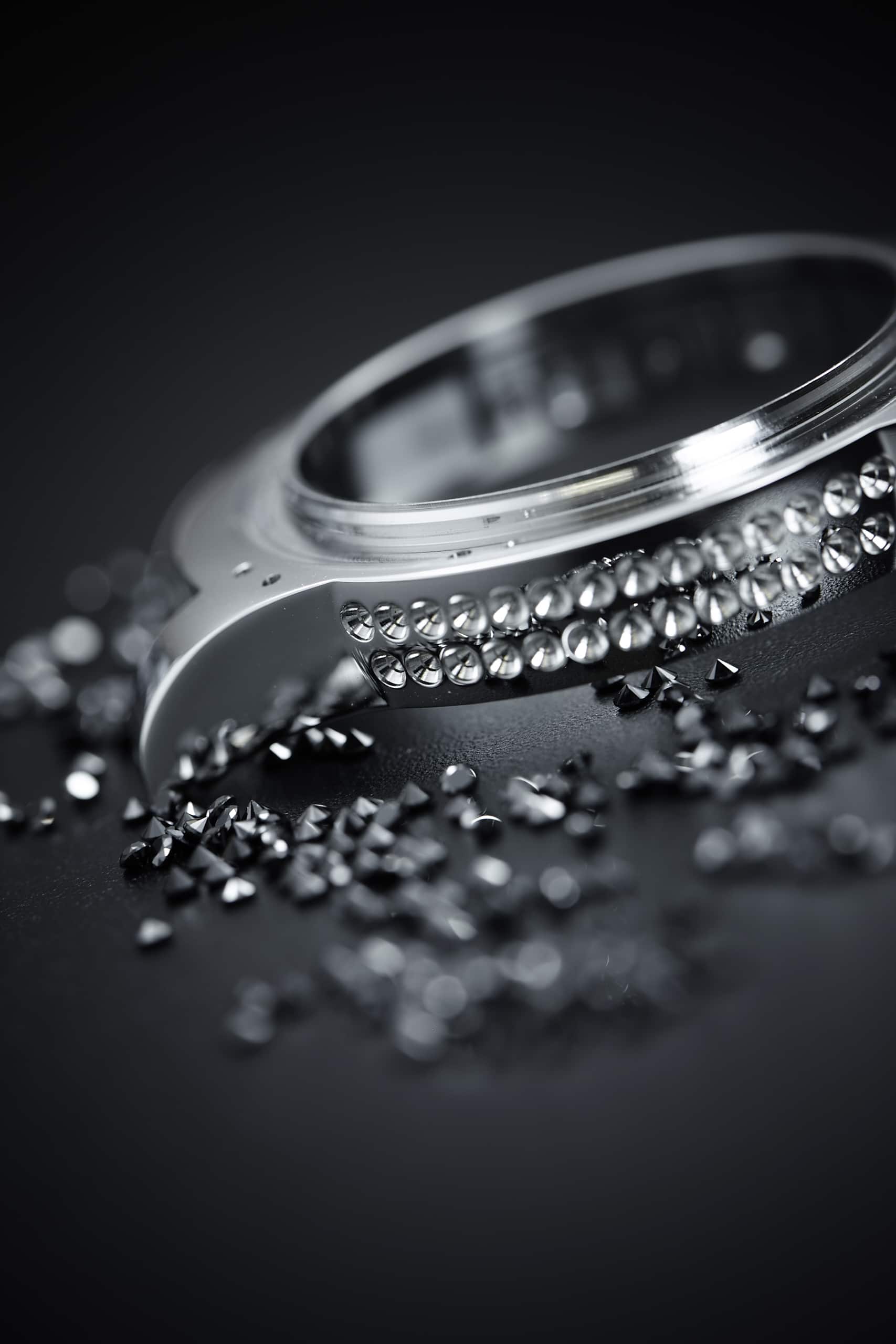 | Gehäuse | 41 mm, Lünette in „rose gold“ besetzt mit 56 weißen Diamanten (ca. 1,2 Karat), DLC-beschichteter schwarzer Stahl besetzt mit 71 schwarzen Diamanten (ca. 1,8 Karat) |