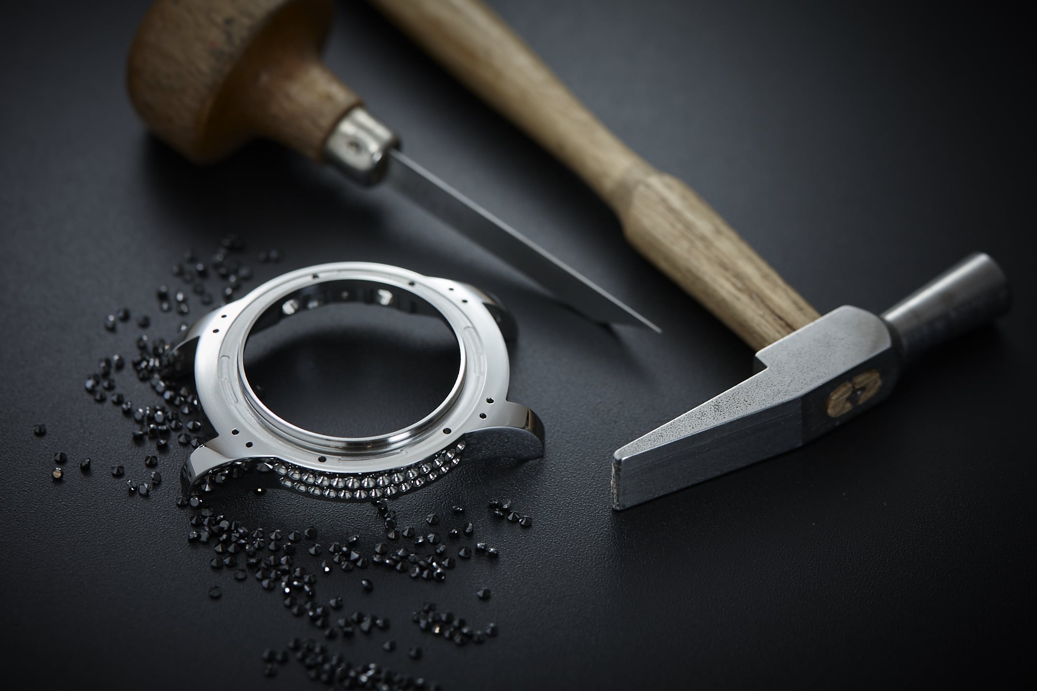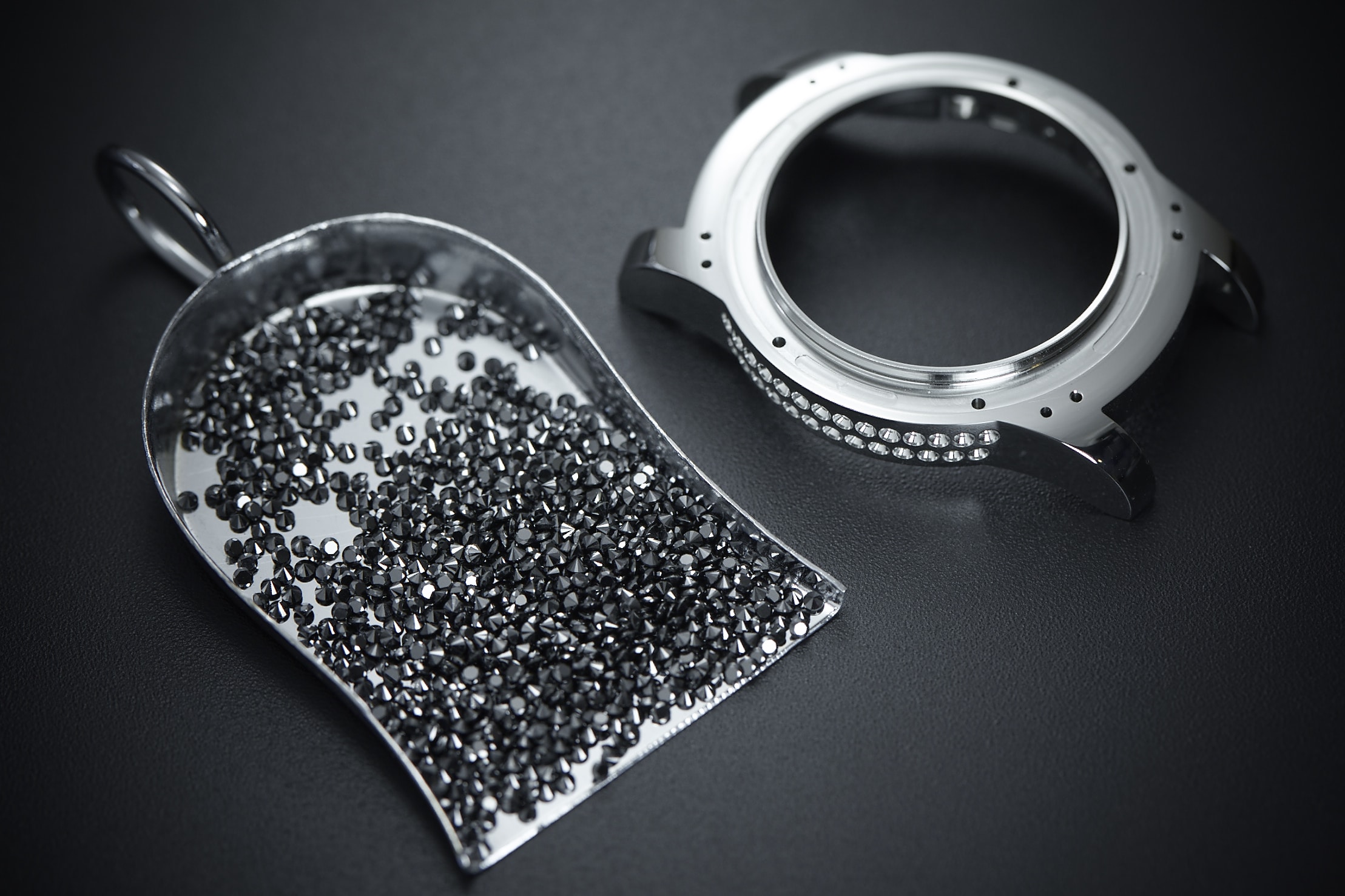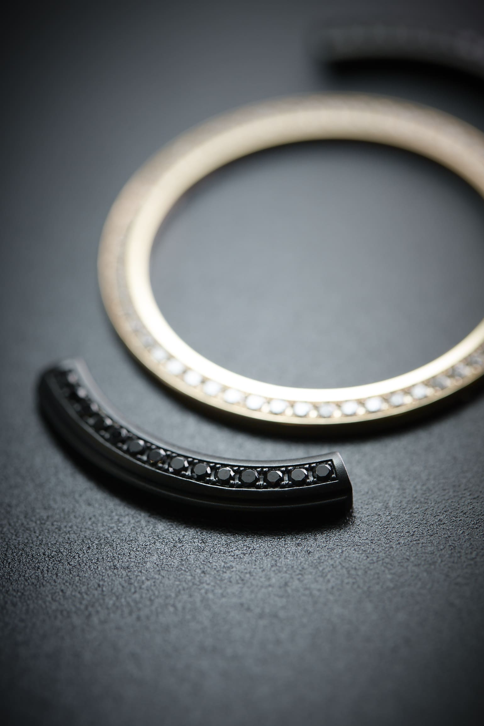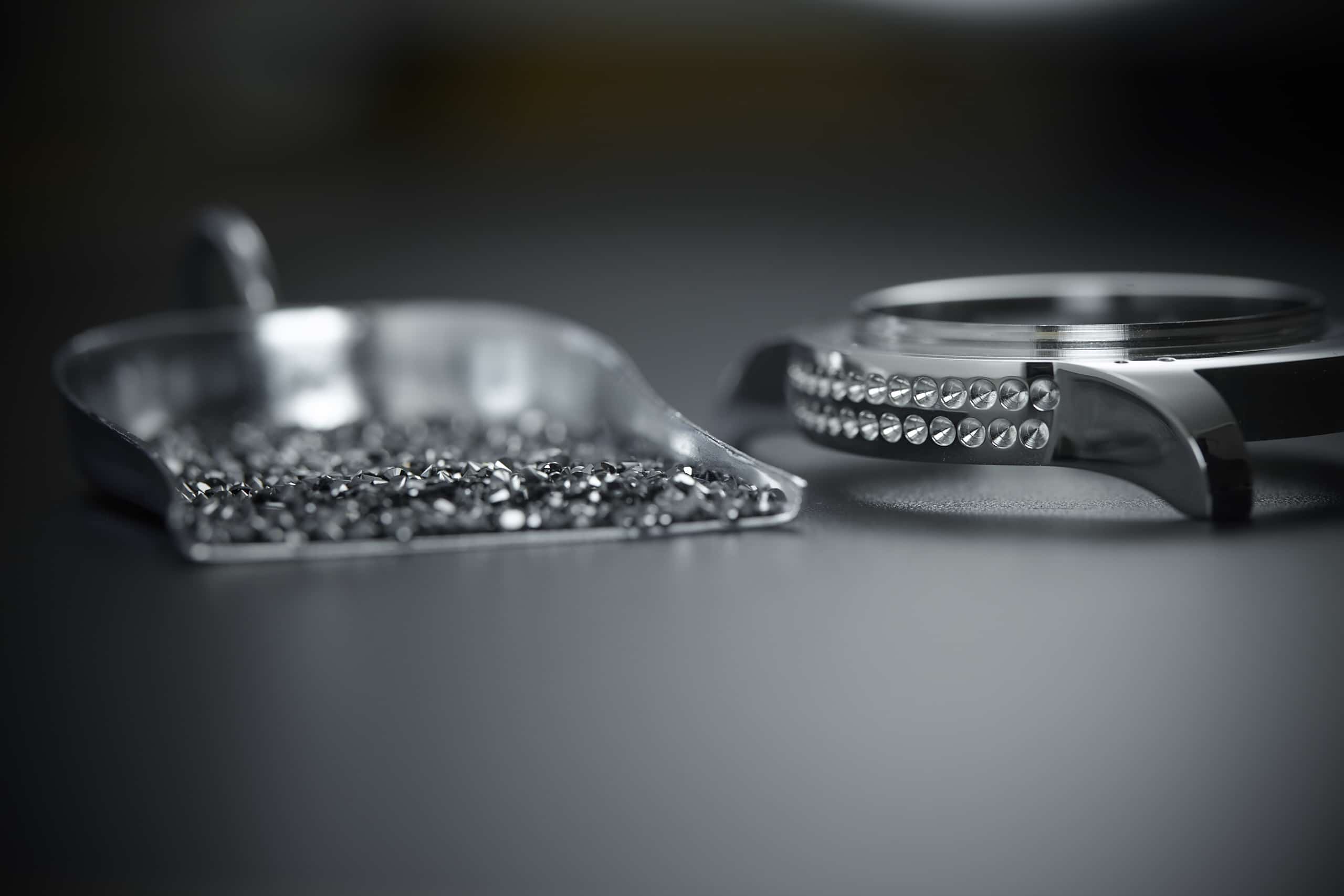 | Gehäuse | 41 mm, Lünette in „rose gold“ besetzt mit 56 weißen Diamanten (ca. 1,2 Karat), DLC-beschichteter schwarzer Stahl besetzt mit 71 schwarzen Diamanten (ca. 1,8 Karat) |