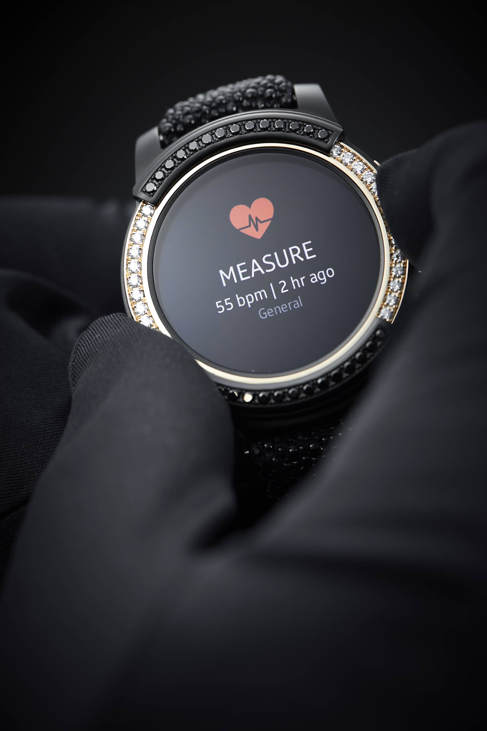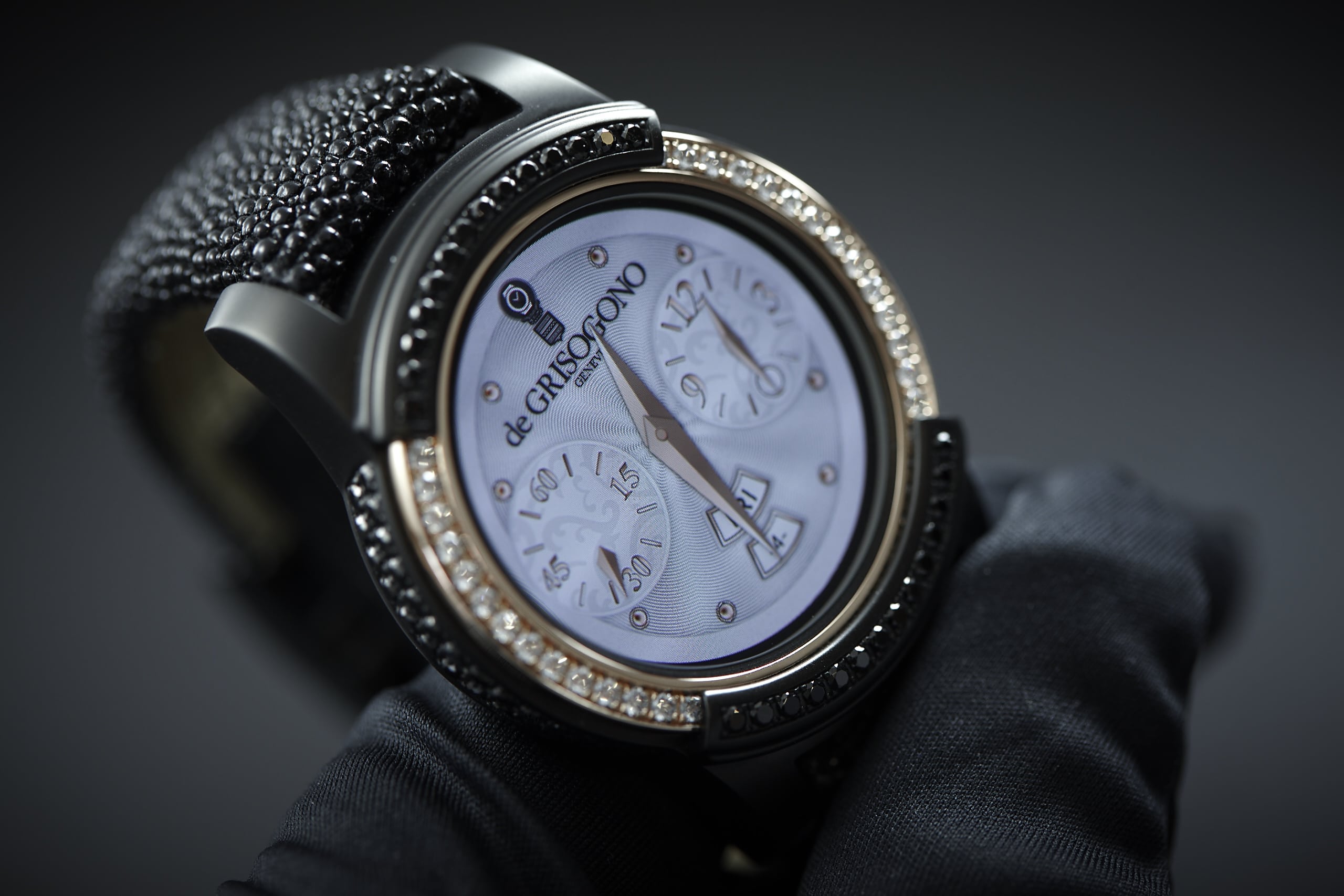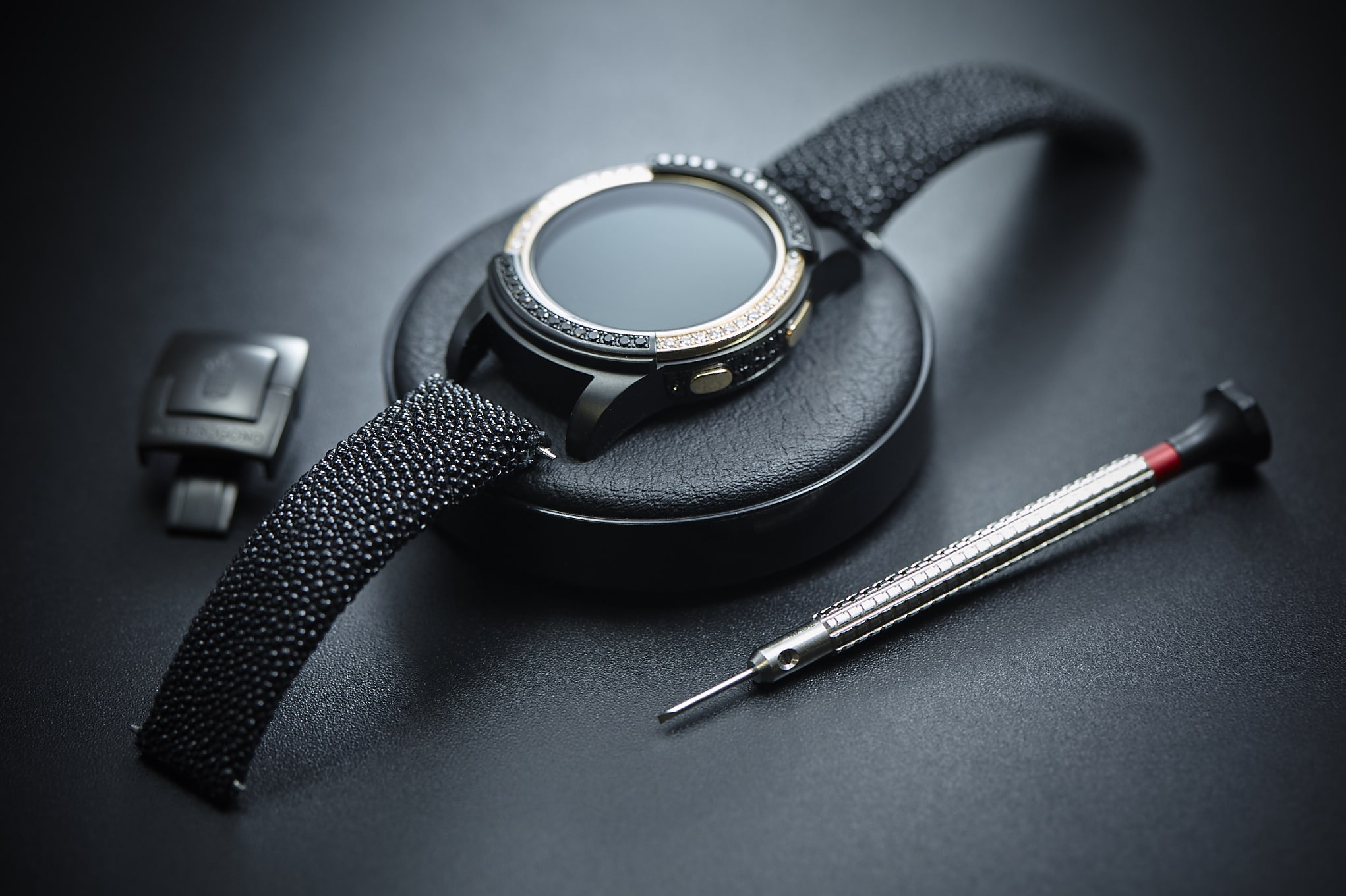 Die Samsung Gear S2 by de Grisogono wird es nur 100x weltweit geben. Die Uhr ist mit über 100 schwarzen und weißen Diamanten besetzt, die Lünette besteht aus Rose Gold.