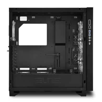 Damit die Hardware im ELITE SHARK CA300H richtig zur Geltung kommt, sind die beiden Seiten aus gehärtetem Glas. Die rechte Seite ist zum Teil schwarz getönt, so stört der Netzteil-Tunnel nicht die Optik. Dagegen wird bei der linken Seite voller Einblick in das Innenleben gewährt und stellt damit die eingebaute Hardware zur Schau. Gerade Komponenten mit RGB-Elementen und hochwertige HDDs bekommen so die verdiente Aufmerksamkeit.