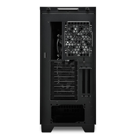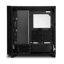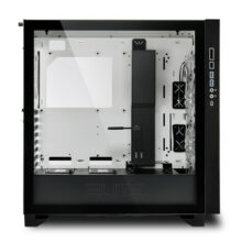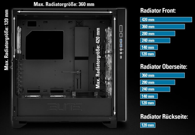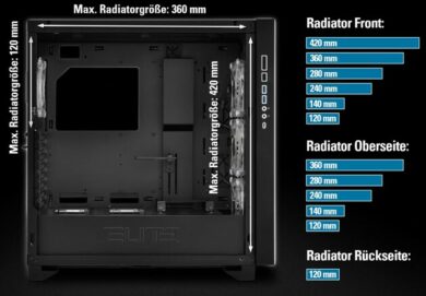 Wem die vier Lüfter ab Werk nicht genügen, der kann wahlweise zwei Lüfter (140 mm) oder drei Lüfter (120 mm) zusätzlich einbauen. Diese finden unter dem Deckel des Midi-Towers Platz. Freunde von Wasserkühlungen können den entsprechenden Kühler direkt vor dem Mainboard installieren. Dort befinden sich passende Langlöcher, welche die Montage eines Ausgleichsbehälters ermöglichen. Die Pumpe wiederum findet auf einer Halterung der Netzteil Blende Platz. Das E-ATX Gehäuse bietet an der Front für Radiatoren in der Größe von 420 mm Platz. An der Oberseite kann man ebenfalls einen Radiator verbauen. Hier ist jedoch nur die Größe von bis zu 360 mm möglich. Beim Einbau an der Vorderseite muss man darauf achten, dass Radiator und Lüfter zusammen nicht tiefer als 6 cm sind. Wenn man jedoch einen Radiator an der Oberseite einbaut, gibt es wohl keine Einschränkungen. Damit der Wärmetauscher nicht mit der Hauptplatine zusammenstößt, hat Sharkoon die entsprechenden Montagelöcher ein wenig nach links versetzt.