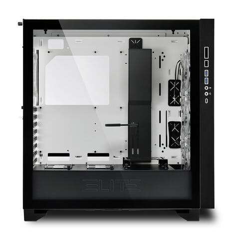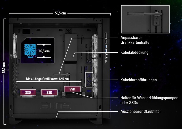 Beim Einbau der Festplatten kann man sich zwischen unterschiedlichen Möglichkeiten entscheiden oder direkt alle nutzen. So bietet das Sharkoon Elite Shark ab Werk einen Käfig, welcher Platz für zwei Datenträger bietet. Darüber hinaus befindet sich unmittelbar hinter dem Mainboard eine Halterung für zwei weitere Festplatten. Doch da ist noch nicht Schluss. So kann man auf dem Netzteil-Tunnel zwei weitere Festplatten installieren. Wenn man keine Wasserpumpe verbaut kann man die entsprechende Halterung ebenfalls für die Installation einer weiteren Festplatte oder eines anderen 2,5 Zoll Laufwerks nutzen. Auch bei den Grafikkarten und Netzteilen gibt es viele Freiheiten. Genauer gesagt kann man sich beim Elite Shark CA300T für entsprechende Hardware in beliebiger Länge entscheiden. Eine spezielle Halterung für die Grafikkarte soll vor einem Durchbiegen schützen.