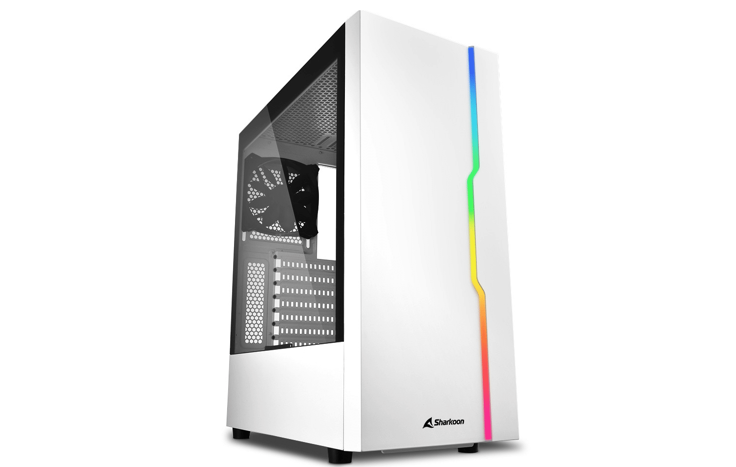 Der Sharkoon RGB Slider White ist ein auf das Wichtigste reduziertes Midi-ATX-Gehäuse mit gewissen Highlights. Die Seitenfenster des Sliders sind aus gehärtetem Glas und die in der Front verbauten RGB-LED-Streifen können in 14 verschiedenen Farb-Modi beleuchtet werden.