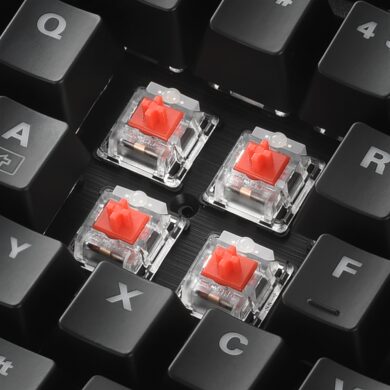 Wie bei den Vorgängermodellen kommen auch bei der Skiller SGK30 mechanische Taster in zwei verschiedenen Varianten zum Einsatz. Die blauen Taster verfügen über eine taktile Charakteristik, lösen bei einer Betätigungskraft von 50 Gramm aus und verfügen über präzise spürbare Umschalt- und Klickpunkte. Die roten Taster weisen hingegen eine lineare Schaltcharakteristik auf und lösen bereits bei einer aufgebrachten Kraft von 45 Gramm aus. Umschalt- und Klickpunkt sind hier nicht spürbar. Die Lebenserwartung der Tasten beträgt in beiden Fällen 50 Millionen Anschläge. Ausgestattet sind sie mit N-Key-Rollover und Anti-Ghosting.