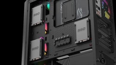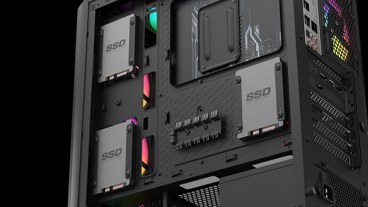 Die Gehäuse unterstützen Grafikkarten bis zu einer Höhe von 159 mm und einer Länge bis zu 345 mm. Im unteren Fach der Gehäuse ist ein Käfig, welcher bis zu zwei 3,5 Zoll Festplatten aufnehmen kann. Dazu können auch hinter dem Mainboard zwei weitere 3,5-Zoll-Festplatten untergebracht werden. Damit ist aber noch nicht Schluss. Drei weitere 2,5-Zoll-SSDs können noch hinter dem Mainboard eingebaut werden. Da sollte der Speicherplatz nun wirklich nicht ausgehen.