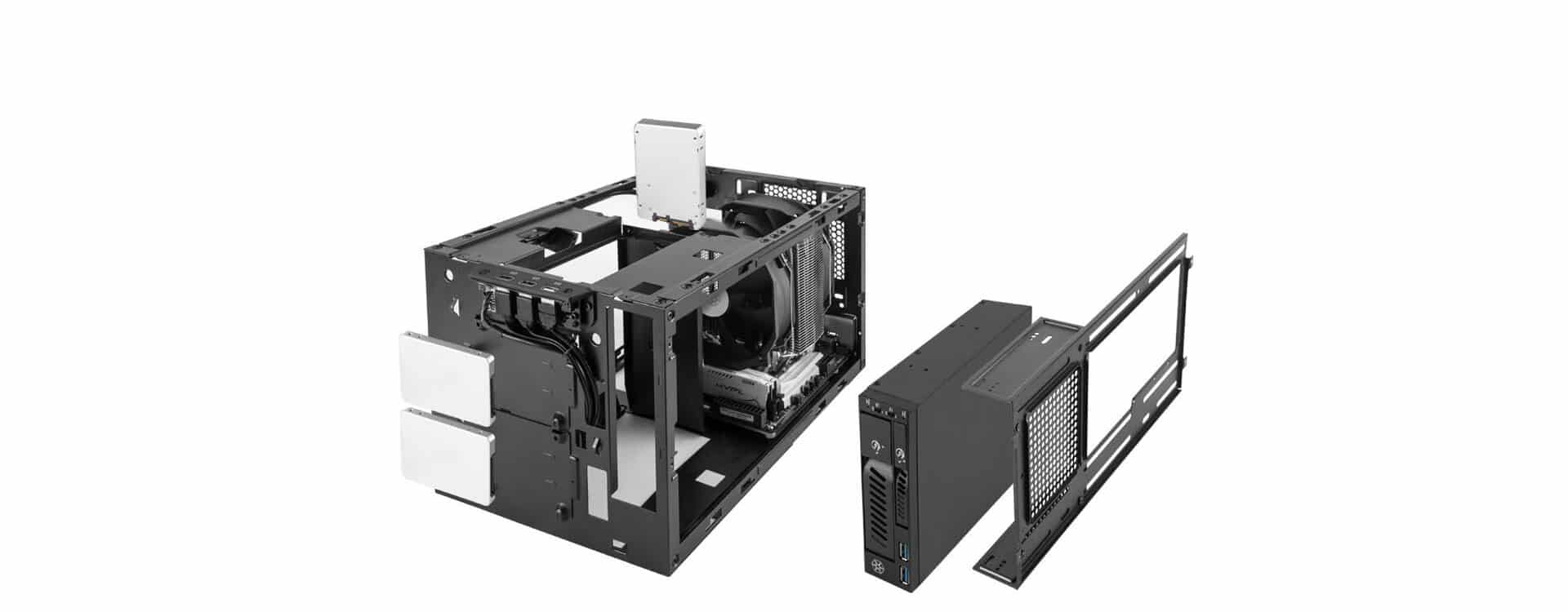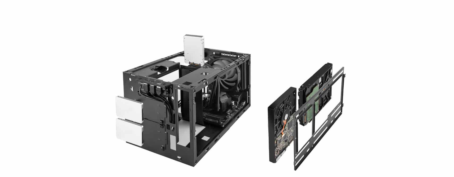 Bei der Grafikkarte hat man ebenfalls freie Wahl. Hier unterliegt man der handelsüblichen Maximallänge von 330 mm und der maximalen Breite von 148 mm. Einzig beim Netzteil muss man sich von Anfang an einer Beschränkung hingeben. Diese unterscheidet sich stark von sonstigen Mini-ITX Gehäusen. So darf das Netzteil wie beim ATX-Format maximal 150 mm lang sein. Um die Abluft des Netzteils zur Oberseite hin zu gewährleisten, wird es vor dem Mainboard installiert. Wie flexibel das Sugo 14 ist, wird spätestens bei einem Blick auf die rechte Seite deutlich. Hier kann man sich zwischen verschiedenen Komponenten entscheiden.