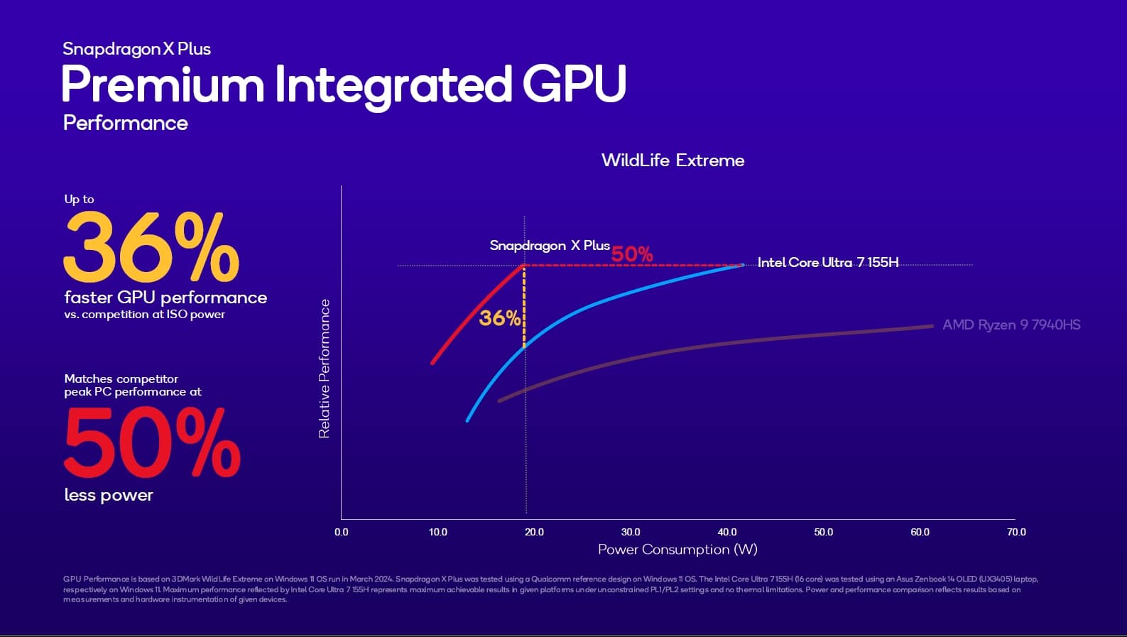 Allerdings sei auch die Performance im Vergleich zum Intel Core Ulta 7 155H und AMD Ryzen 9 7940HS mehr als beachtlich. Der X Plus soll, erneut in Geekbench, bei derselben ISO-Power bis zu 37 Prozent schneller arbeiten und dieselbe Leistung der Konkurrenten bei 54 Prozent weniger Energieverbrauch realisieren.