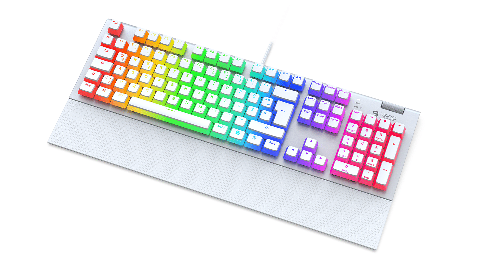 Anders als bei der GK630K mit TKL-Layout, setzt die SPC Gear GK650K Omnis Pudding Edition auf ein volles Tastatur-Layout inklusive Nummernblock. Angeboten wird die Tastatur in einer weißen und einer schwarzen Farbgebung, sowie mit den Schalter-Typen Kailh Red (linear), Kailh Brown (taktil), Kailh Blue („clicky“).