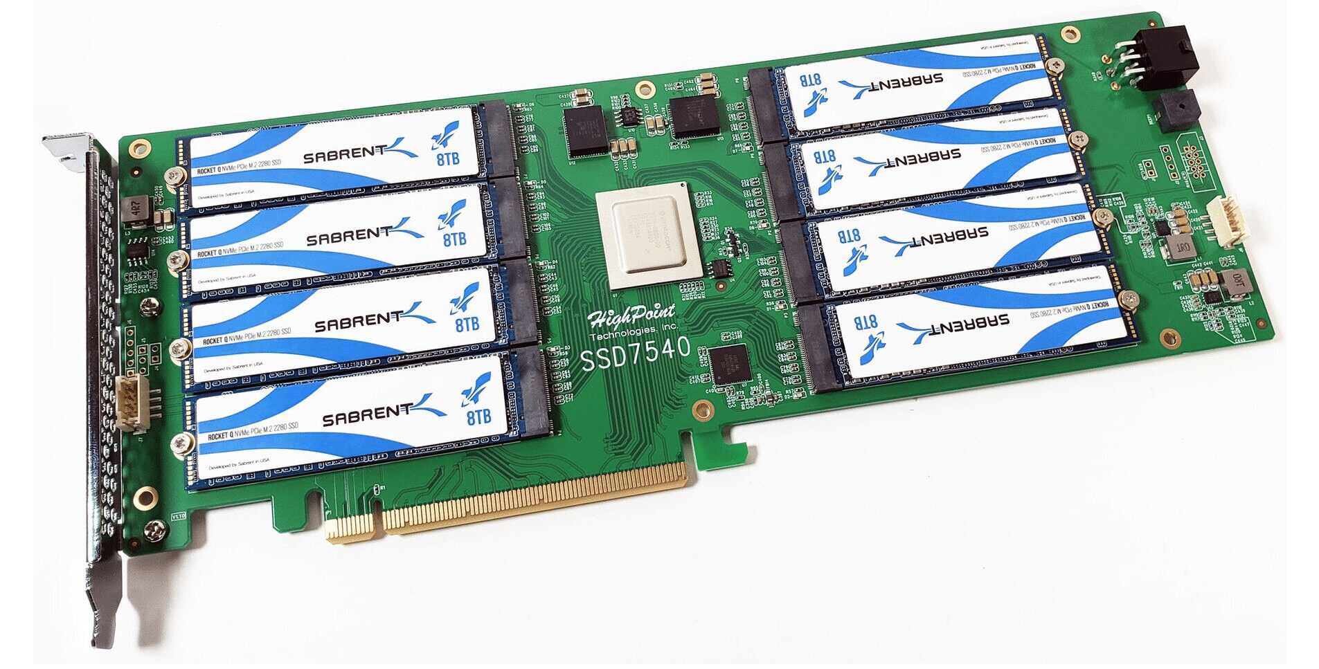 Beim kommenden Produkt aus dem Hause Sabrent scheint es sich um einen wahren SSD-Hort zu handeln. So finden hier bis zu acht M.2-SSDs Platz. Da jede SSD hier bis zu 8 Terabyte Speicherplatz vorweisen darf, schafft es das RocketQ Battleship auf eine theoretische Gesamtkapazität von 64 Terabyte – eine gigantische Speichergröße. Doch nicht nur die reine Kapazität, sondern auch die Specs drum herum scheinen zu überzeugen. So lassen sich die einzelnen SSDs laut Sabrent zu einem NVMe-RAID-Verbund verknüpfen. Die Geschwindigkeiten sollen hierbei bis zu 28 GB/s erreichen können. Damit die ambitionierte Maximalgeschwindigkeit überhaupt möglich ist, setzt Sabrent auf einen Highpoint SSD7540-Raidcontroller.