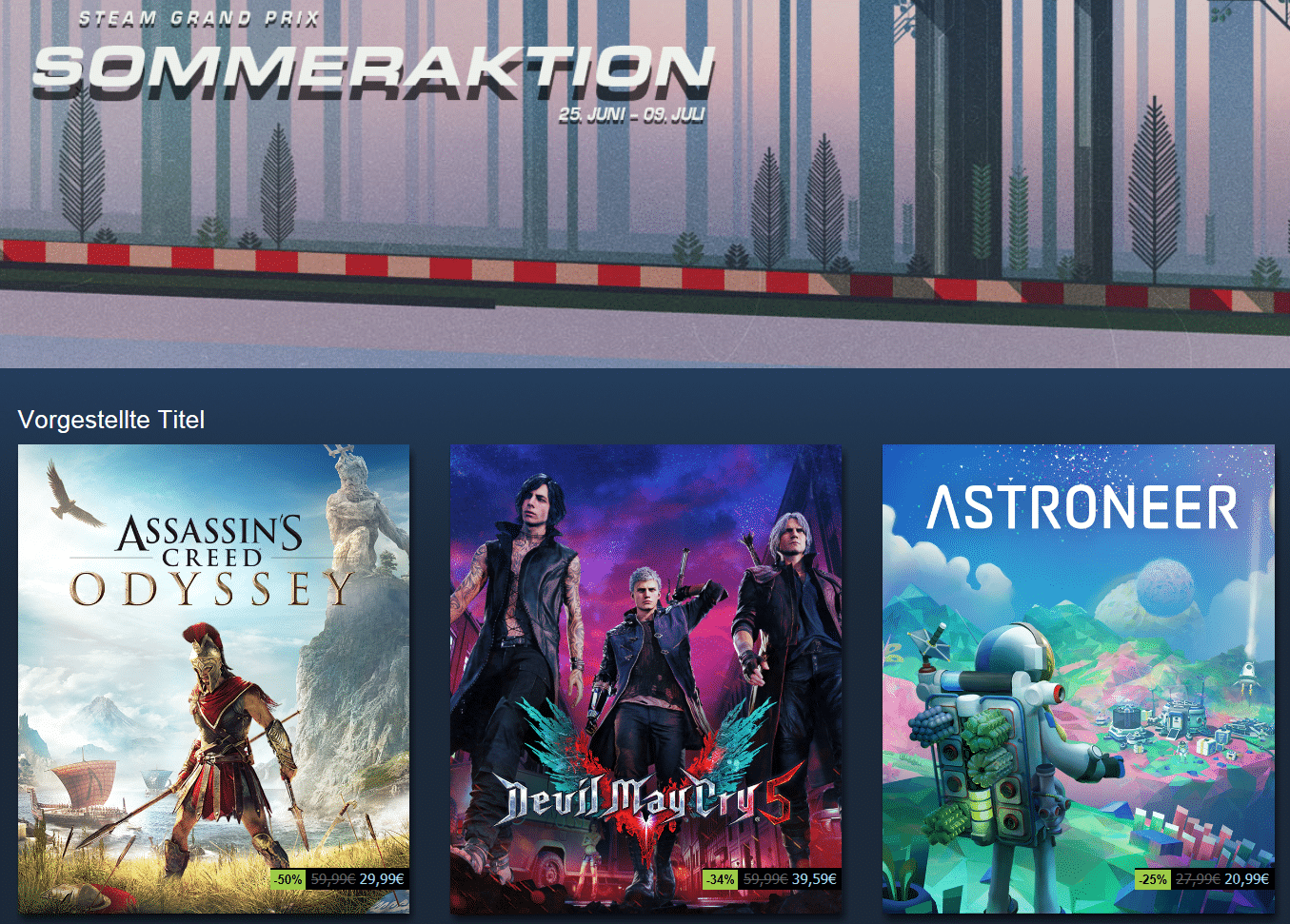 Also, in Steam einloggen, Team wählen und eventuell nochmal die Wunschliste anpassen. Ansonsten schlagt bei den Angeboten zu, der Sale startet schon interessant mit Assassin’s Creed: Odyssey für 29,99 Euro (-50%), Devil May Cry 5 für 39,59 Euro (-34%) und Astroneer für 20,99 Euro (-25%).