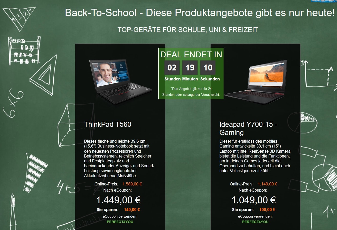 Hier kommt ihr direkt zu den Lenovo Back to School Angeboten. Jedoch solltet ihr hier schnell zuschlagen, wenn ihr ein Produkt gefunden habt, was euch interessiert. Denn jedes Angebot hält nur 24 Stunden! Eventuell müsst ihr im Warenkorb noch einen eCoupon Code angeben, dieser lautet: „PEFERCT4YOU“.