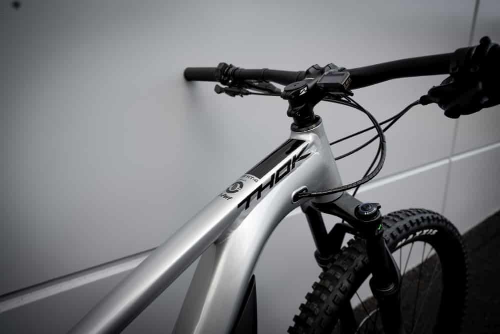 Nochmals deutlich sportlicher präsentiert sich hingegen das Thok MIG-HT-R. Es erinnert optisch stark an das andere Thok E-Bike, wartet allerdings in einer silbernen Farbgebung (genannt „Shining Waterfall“) auf. Weitere Unterschiede finden sich in den Details des E-Hardtrail Bikes.