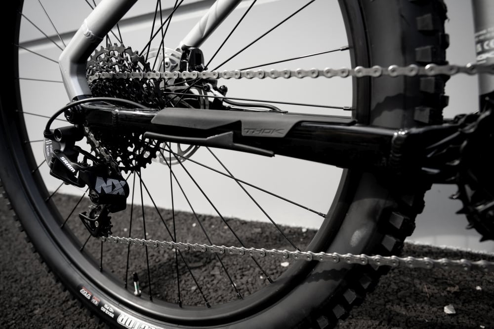 Das HT-R ist wie alle R-Modelle von THOK die Version mit den leistungsstärksten Komponenten und daher mit Sram NX 11-fach Schaltung, Sram Guide T Vier-Kolben Bremsen, 29×2.6 Maxxis Dissector-Reifen und einer Teleskopsattelstütze ausgestattet.