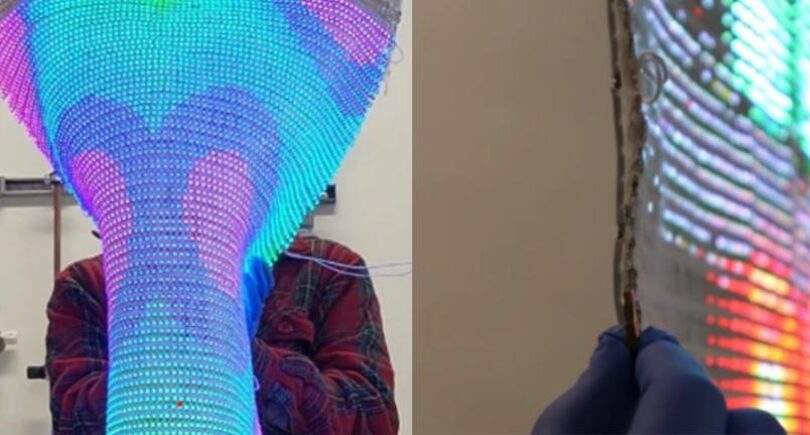 Dieses Stück Stoff wird dann durch LEDs mit den Farben rot, blau und grün ergänzt. Um für Stromversorgung zu sorgen, werden feinste Kupferdrähte in das Stoffteil gewoben. Ergebnisse des Experiments sind nun über das Magazin Eenewseurope bekannt geworden. Das besagte „Stoff-Display“ hat eine Bildschirmdiagonale von 46 Zoll. Sinn und Zweck des Ganzen ist allerdings nicht, den Webstoff wie eine Art Wandteppich anzubringen. Stattdessen soll man ihn um Objekte wickeln können, um diese Bilder anzeigen zu lassen.