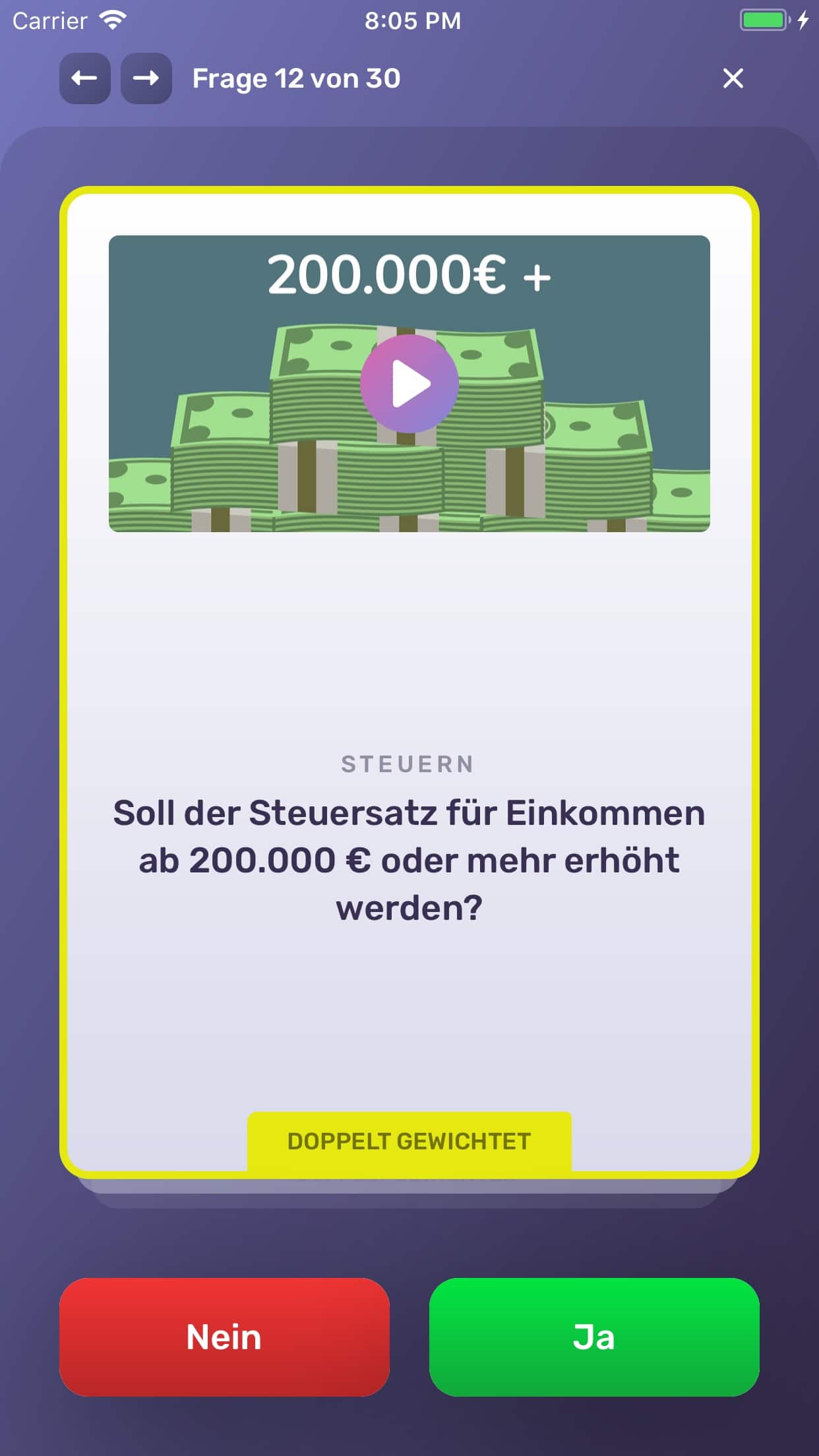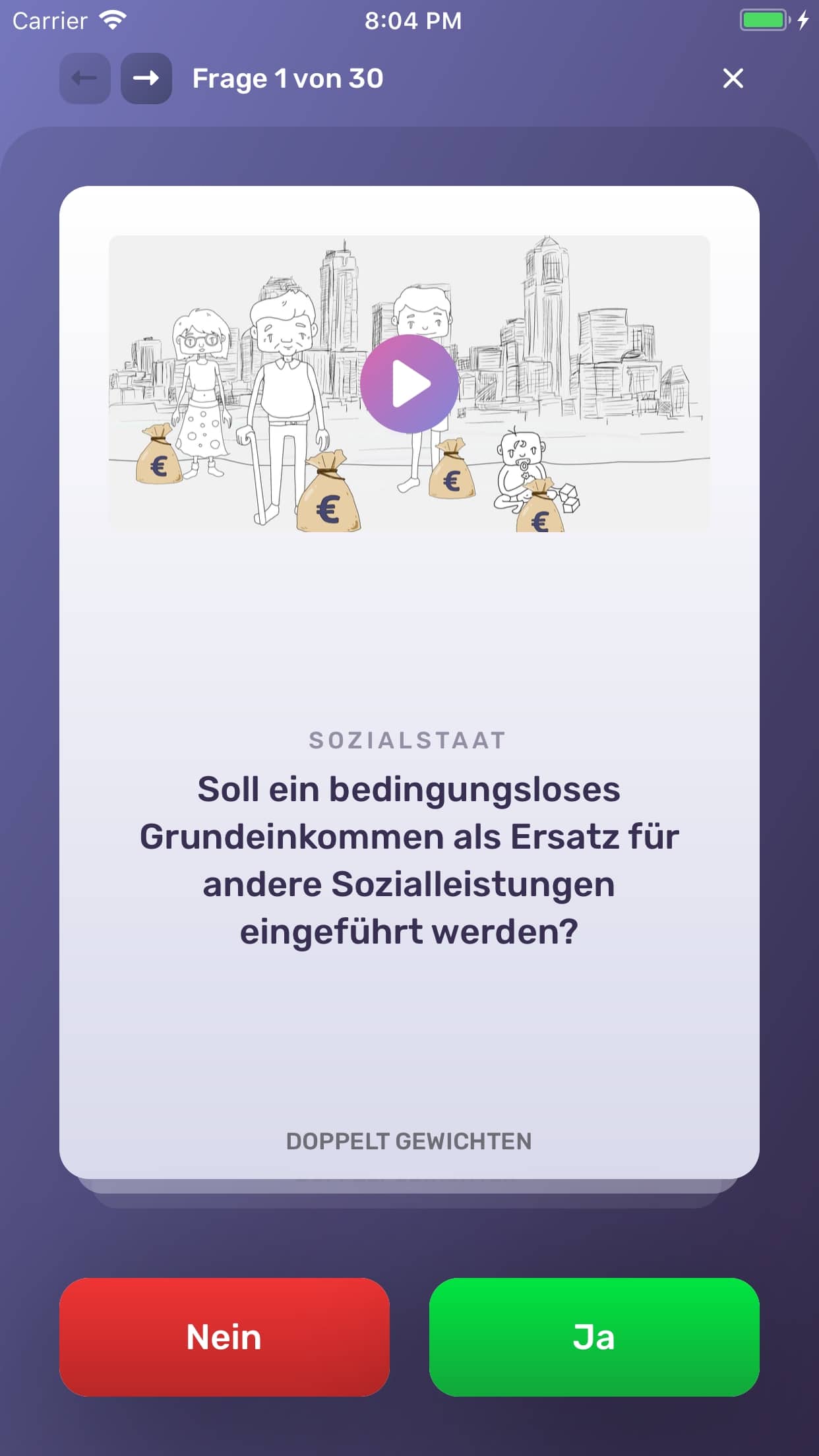 Eine weitere Besonderheit des WahlSwipers gegenüber des Wahl-O-Mats: Die App bietet auch kurze Erklärungen zu den einzelnen Fragen bzw. Thesen an, zum Teil auch als kurzes Video, das sich über den dreieckigen Play-Button über der jeweiligen Frage abspielen lassen.