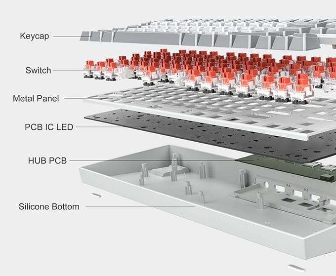 Die Tastatur wartet mit 87 Tasten im platzsparenden TKL-Layout auf und bietet die Möglichkeit, sowohl die Tastenkappen (Keycaps) als auch die die mechanischen Schalter (Switches) schnell und einfach dank Hot-Swap-Fähigkeit auszutauschen. Es ist kompatibel mit allen Switches, die über einen 3-Pin- und 5-Pin-Anschluss verfügen.