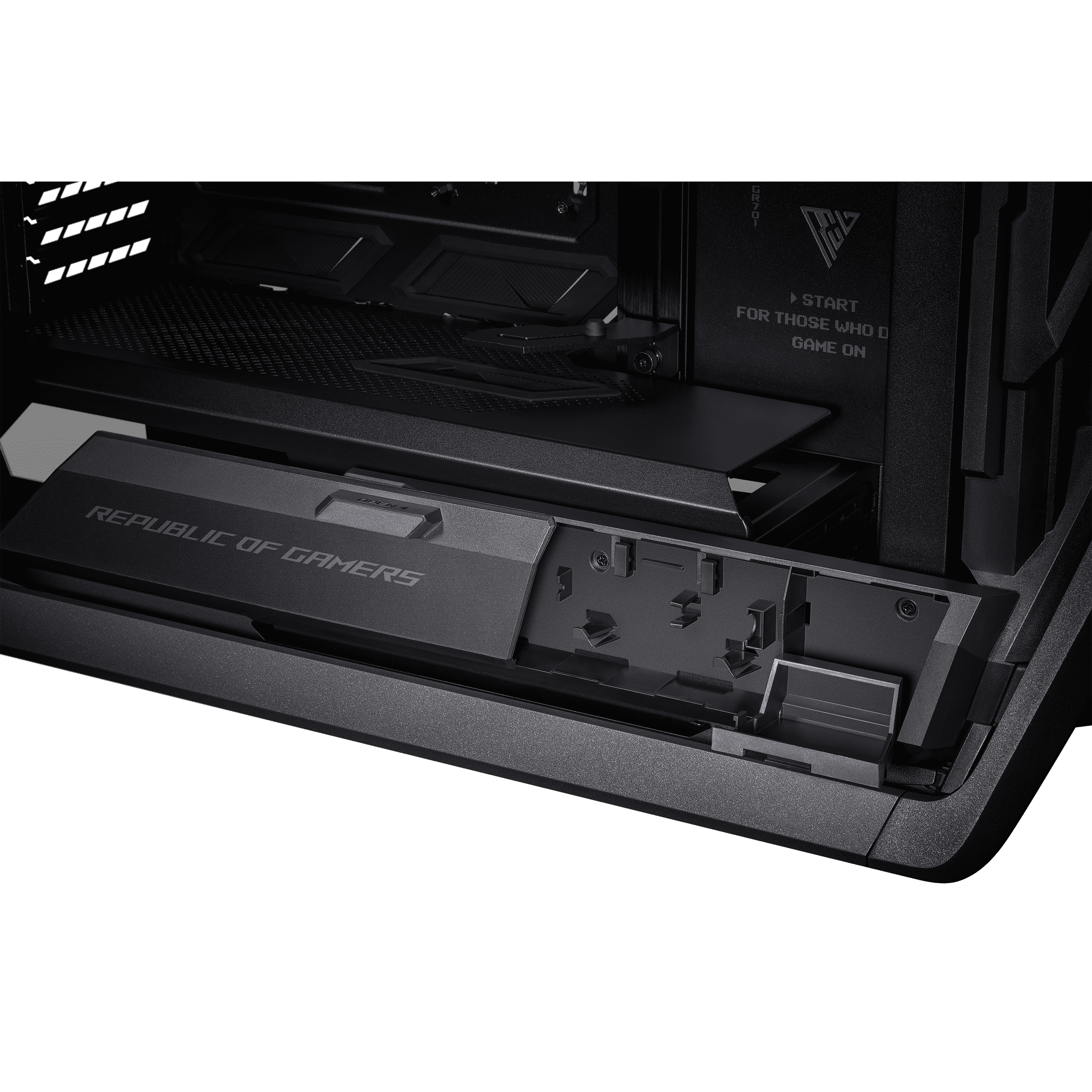 Die Seitenteile sind komplett werkzeuglos und die Abdeckung des Netzteils wurde so gestaltet, dass der Airflow gewährleistet ist und die Löcher klein genug sind, um zu verhindern, dass Schrauben durchfallen. In der Abdeckung befindet sich außerdem eine kleine Öffnung für das OLED-Panel des ROG Thor, auf dem der Stromverbrauch angezeigt werden kann.