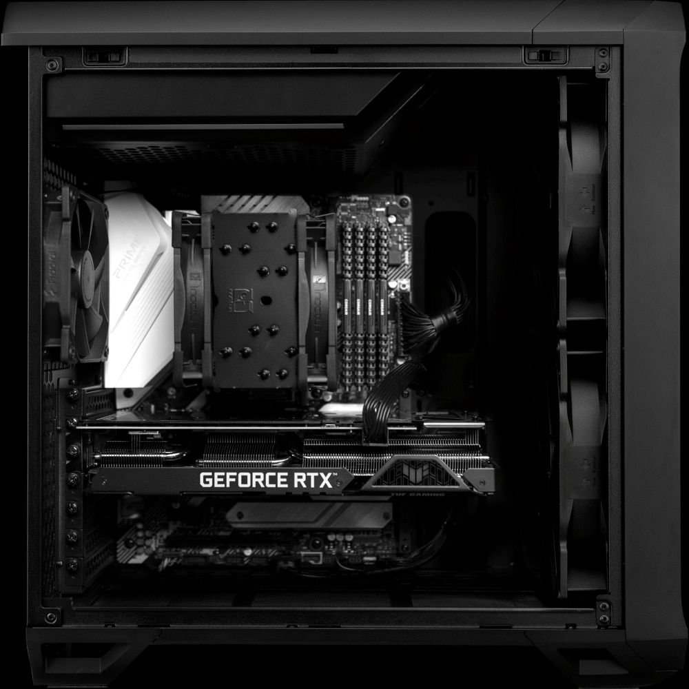 Die CPU wird von einem Noctua NH-U12A gekühlt, der entweder mit braun-beigen Lüftern und silbernem Kühlkörper oder in der vollständig schwarzen Chromax-Version auswählbar ist. XMG stattet die Lüfter mit einer besonders angepassten Kurve aus, die die optimale Balance zwischen starker Kühlleistung und leisem Betrieb unter Volllast bieten soll. Auf eine RGB-Beleuchtung verzichtet der High-End-Desktop-PC dabei konsequent, um nicht von der Arbeit abzulenken.