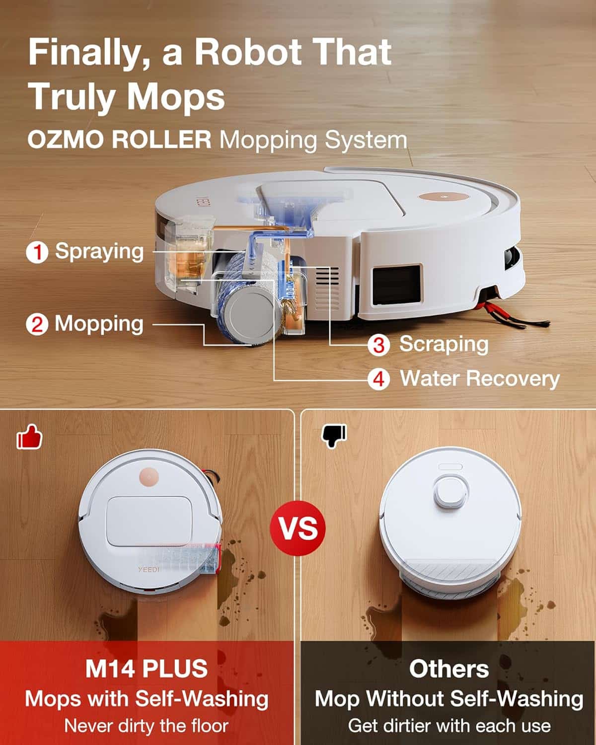 Der M14 Plus geht bei der feuchten Reinigung eigene Wege: Statt zwei rotierender Mopps nutzt der Roboter eine einzelne Reinigungswalze, die permanent mit Frischwasser benetzt und gleichzeitig mechanisch gereinigt wird. Diese Technik verhindert effektiv das Verschleppen von Schmutzpartikeln – ein häufiges Problem bei konventionellen Systemen. Besonders bei eingetrocknetem Schmutz oder Küchenböden mit Fett und Krümeln dürfte dieses Prinzip einen deutlichen Unterschied machen.