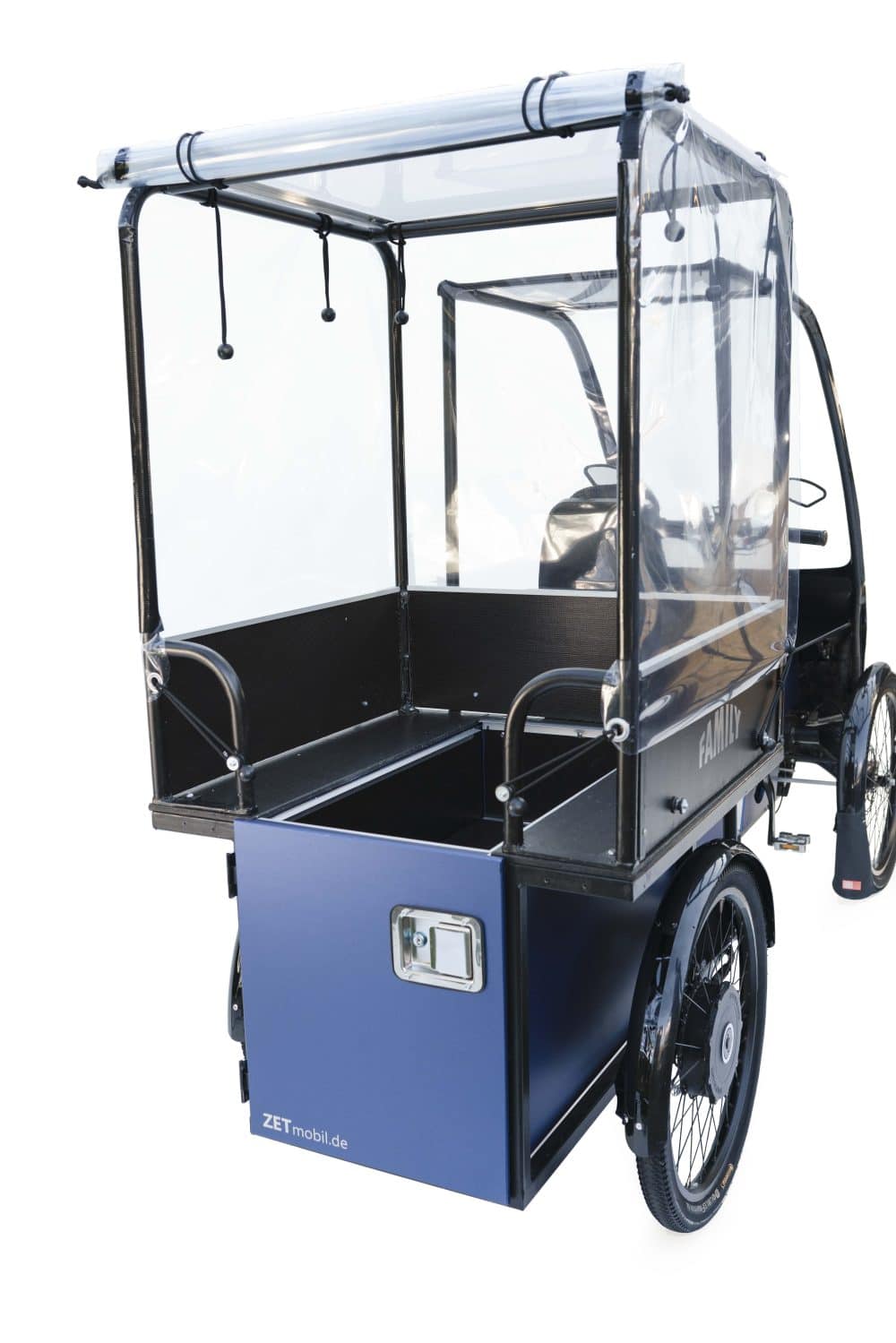 Sie besitzt einen wetterfesten Aufbau und Gurte, bietet Platz für bis zu vier Kinder und enthält eine kleinere, 50‑Liter-Transportbox. Zusätzlich ist das ZET Box als klassisches Lastenbike mit jeder Menge Stauraum erhältlich. Hier gibt’s einen riesigen, abschließbarem Stauraum von 670 l, ideal für große Einkäufe oder sperrige Fracht.