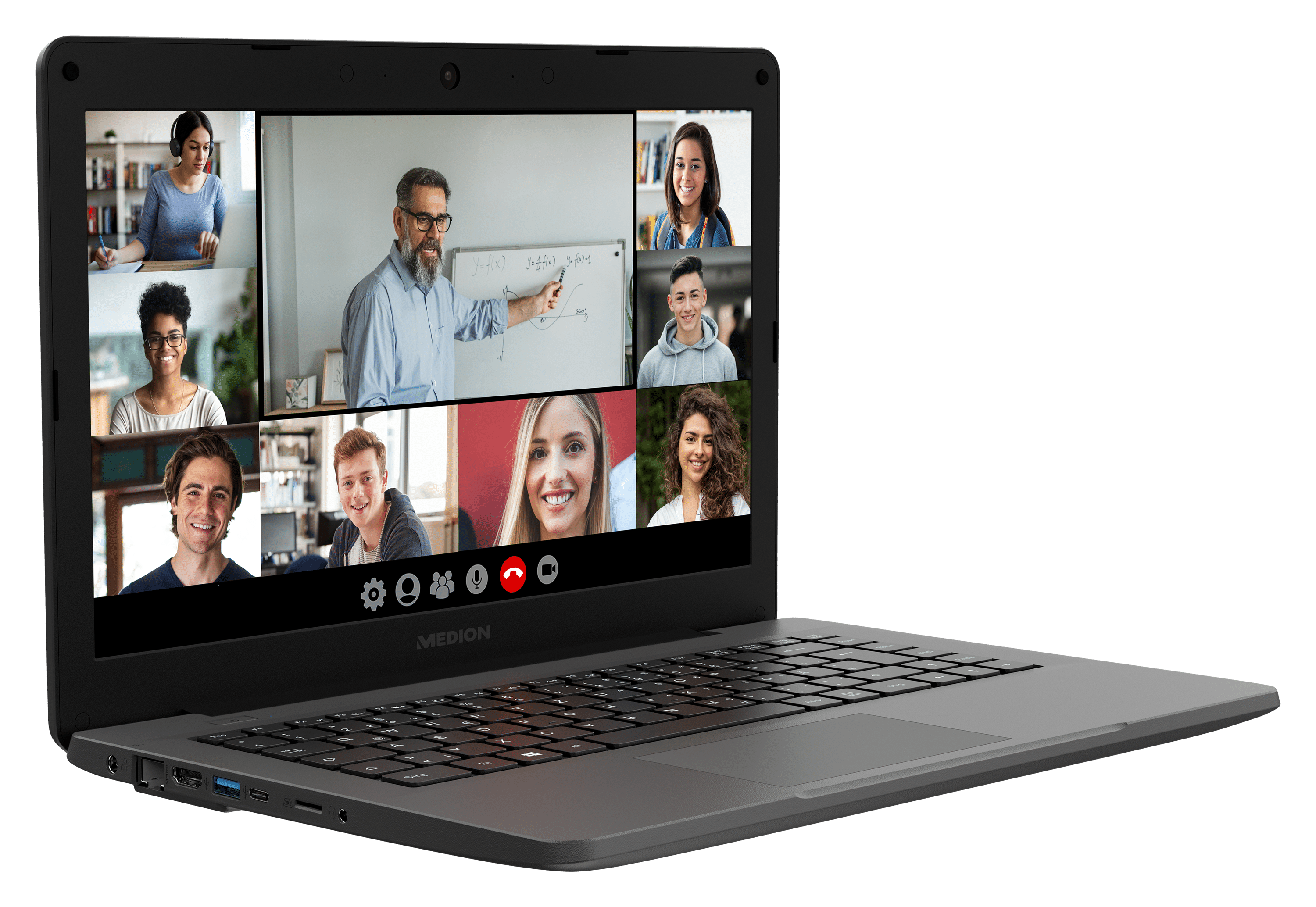 Bei den Anschlüssen bietet das Medion Akoya E14410 einen Kartenleser für microSD-Speicherkarten, einen USB 2.0, zwei USB 3.2 Gen1 Typ-A, einen HDMI, einen LAN (RJ-45), einen VGA, einen Micro-SIM-Karten-Slot, einen Netzadapteranschluss und einen Audio-Kombi-Anschluss.