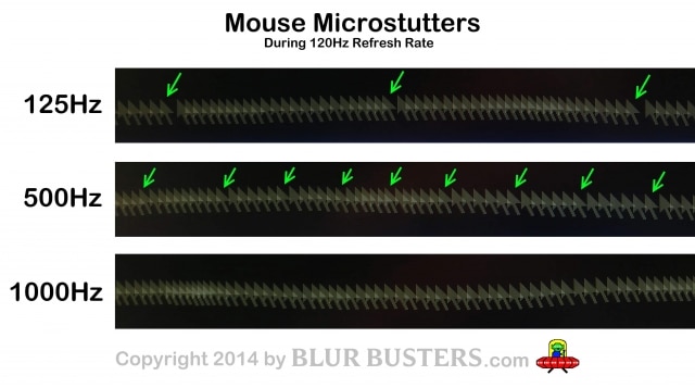 Kommt es also auf die Geschwindigkeit an, sind Mäuse mit höheren Polling-Raten zu bevorzugen. Mäuse mit geringeren Polling-Rates wie etwa 125 „stottern“, was bedeutet, das Übertragungen gelegentlich aussetzen können.