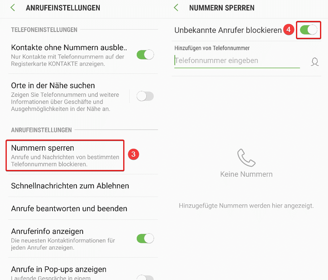 - Zuletzt muss der Schieberegler ganz oben aktiviert werden. Darunter lassen sich im Übrigen auch einzelne Telefonnummern eintippen, die blockiert werden sollen.