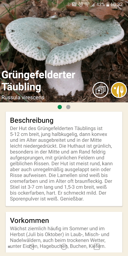 Die erste App in unserer Liste sei all denjenigen ans Herz gelegt, die der englischen Sprache mächtig sind. Shroomify punktet bereits auf den ersten Blick durch sein übersichtliches Design und eine unkomplizierte Handhabung. Herzstück ist dabei der „Pilz-Identifikations-Button“, den du direkt im Hauptmenü drücken kannst. Einmal auf der entsprechenden Seite angekommen, gibst du Angaben zu Größe, Form und Farbe Pilzes ein. In einem weiteren Reiter wird dir eine Liste mit essbaren Pilzen angezeigt. Damit diese nicht allzu lang ist, kannst du der App mittels GPS deinen Standort verraten. Im Zuge dessen weiß Shroomify, welche Speisepilze in deiner Umgebung heimisch sind. Damit du weißt, welche Suche sich lohnt, gibt dir die App außerdem eine weitere Liste aus, die Pilze zeigt, die in der aktuellen Saison am häufigsten zu finden sind. Die vierte Auflistung, auf die zu Zugriff erhältst, ist mindestens genauso wichtig. Hier listet Shroomify die Pilze auf, die giftig oder gar tödlich für den Menschen sind. Auch in dieser Liste kannst du wieder nach Regionen filtern. Im fünften Reiter der App bekommst du außerdem praktische allgemeine Tipps für das Sammeln von Pilzen.