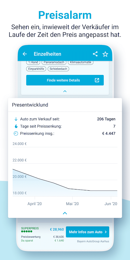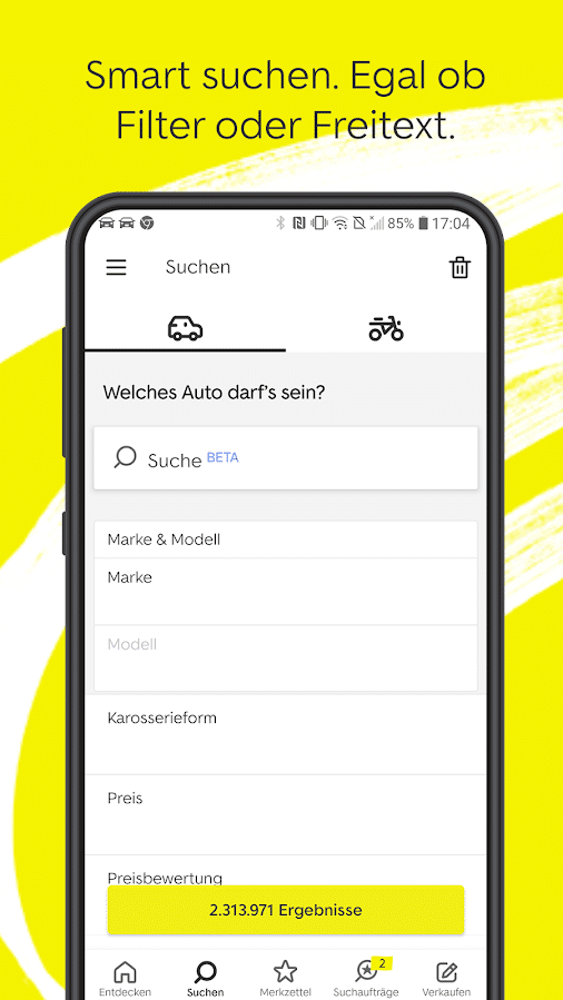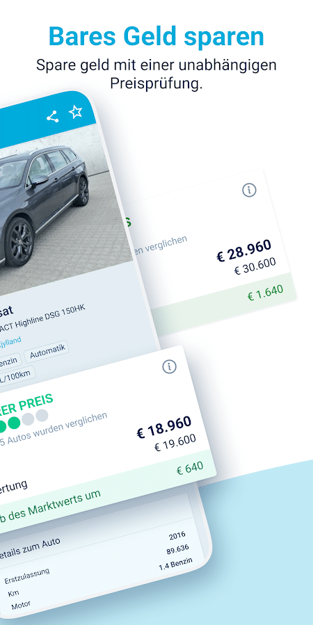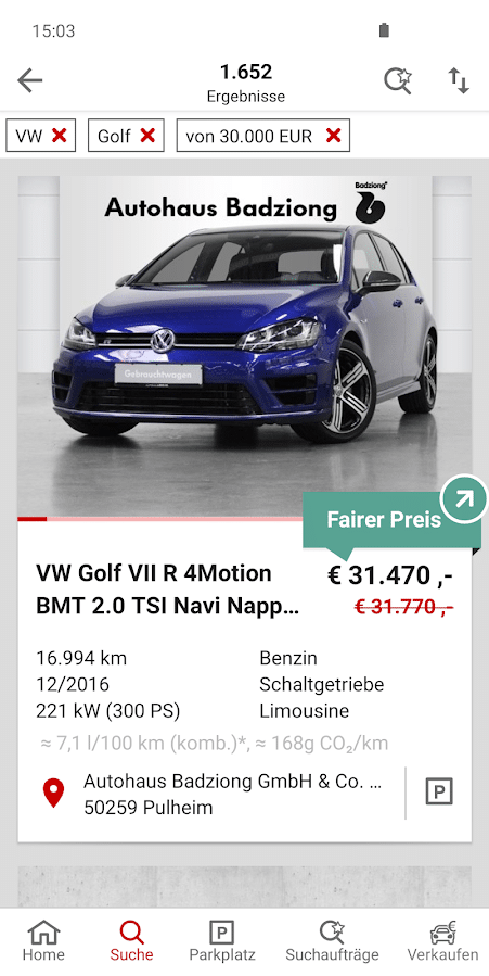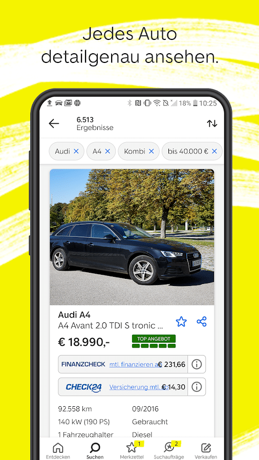 Die Suche nach einem neuen Auto kann Wochen in Anspruch nehmen. Damit du dabei nicht den Überblick verlierst, kannst du passende Inserate für später abspeichern. So kannst du dich nach deiner selbst gesetzten Frist zur Suche auf deinem virtuellen persönlichen Parkplatz für das passende Gefährt entscheiden. Anhand der Preisbewertung eines jeden Inserats können auch Laien schnell erkennen, ob es sich um ein gutes Angebot handelt oder nicht. Selbst bei der Abholung deines Wunschfahrzeugs hilft dir mobile.de. So zeigt dir die App die schnellste Route zum Anbieter an.