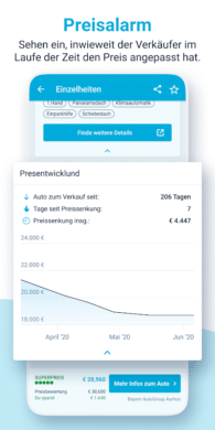 Nicht nur der Kauf eines neuen oder gebrauchten Autos ist mit AutoScout24 kein Problem. Obendrein kannst du dein altes Fahrzeug gewinnbringend an den Mann oder die Frau bringen. Egal, ob klassisches Auto oder Motorrad bzw. Roller. Bei AutoScout24 lässt sich nahezu jedes motorisierte Gefährt kaufen oder verkaufen. Den Entwicklern von AutoScout24 ist bewusst, dass es sich beim Autokauf in aller Regel um einen langandauernden Kaufprozess handelt. Dementsprechend kannst du gezielt Alarmfunktionen und spezielle Suchaufträge anlegen. Um dich beim Inserat deines Fahrzeugs zu unterstützen, kannst du außerdem die kostenlose Preisbewertung von AutoScout24 nutzen. Besonders praktisch ist übrigens die Funktion „AutoScout360°“. Hier kann man sich das Auto seiner Träume virtuell aus jedem Winkel ansehen.