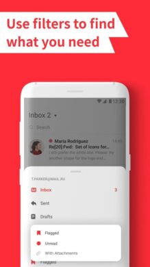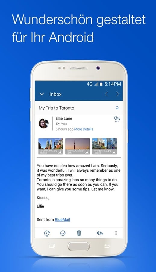 Zusätzlich bietet Blue Mail eine umfassende Android Wear-Integration (etwa für Smartwatches und ähnliche Geräte), mobiles Drucken und intelligente mobile Benachrichtigungen, die das E-Mail-Erlebnis auf Smartwatches und mobilen Geräten verbessern. Mit der App kannst du ferner E-Mails für eine spätere Bearbeitung markieren, Erinnerungen setzen und Schnellfilter nutzen, um dein Postfach effizient zu filtern und zu organisieren. Visuell ansprechend zeigt Blue Mail Bilder der Absender und sowie die Logos der genutzten Dienste und bietet farbcodierte Benachrichtigungen für eine noch einfachere Verwaltung.