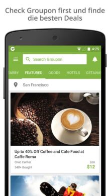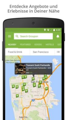 Unter den Gutscheinapps ist Groupon wohl der absolute Klassiker. Dementsprechend trifft man hier auch auf eine umfangreiche Auswahl an verschiedenen Gutscheinen. Dank der praktischen Filtereinstellungen kann man nicht nur gezielt nach Kategorien suchen. Darüber hinaus kann man hier nach dem Standort filtern. Das macht die Suche nach Gutscheinen in der Umgebung oder dem kommenden Urlaubsziel möglich. Denn die Gutscheine bei Groupon betreffen keineswegs nur deutsche Erlebnisse. Hier bekommt man die Möglichkeit, internationale Gutscheine zu erhalten. Die Kategorien sind breit gefächert. Neben kulinarischen Genüssen kann man sich auch ganz besondere Events oder einen Wellnessausflug gönnen. Es ist gerade diese Vielseitigkeit, die Groupon bei seinen Nutzern so beliebt macht. Per Groupon App kann Du den Gutschein völlig unkompliziert in den Warenkorb legen und direkt bezahlen. Wahlweise kannst Du den QR-Code des gekauften Gutscheins per App anzeigen lassen oder ihn als hübschen Geschenkgutschein ausdrucken. Hierbei solltest Du stets auf die Einlösebedingungen des jeweiligen Anbieters achten.