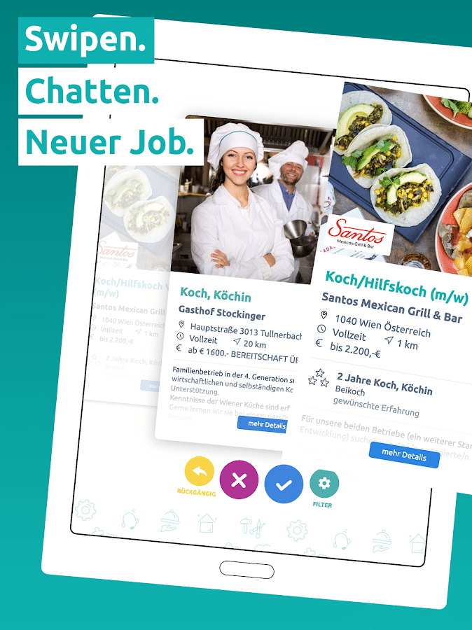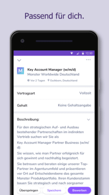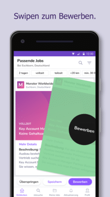 Monster erlaubt es Dir, Dich schnell und einfach für den passenden Job zu bewerben. Doch auch auf dem Weg zur Bewerbung nimmt die Job-App Dich erfreulich unkompliziert an die Hand. Du entscheidest, welcher Job Dich interessiert. Dabei spielt es keine Rolle, wo Du Dich gerade befindest. Dank der praktischen App kannst Du immer und überall nach Deinem Traumjob suchen. Damit Du bei den tausenden von Stellenangeboten nicht den Überblick verlierst, kannst Du die maßgeschneiderten Jobs mithilfe mehrerer Filteroptionen finden. Monster bietet Dir die Möglichkeit, Deine Bewerbungsunterlagen zu speichern. So kannst Du Dich schnell und ohne lange Wartezeit bei dem Arbeitgeber Deines Traumes bewerben. Dabei ähnelt die moderne Jobsuche auf Monster mittlerweile ein wenig der Dating-App Tinder. Wenn Dir ein Inserat gefällt, swipest Du einfach nach rechts. Schon werden Deine Bewerbungsunterlagen an den Steller des Inserats weitergeleitet. Schneller kann man sich kaum bewerben.