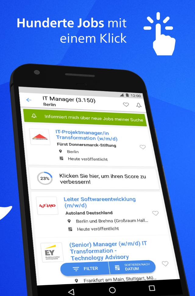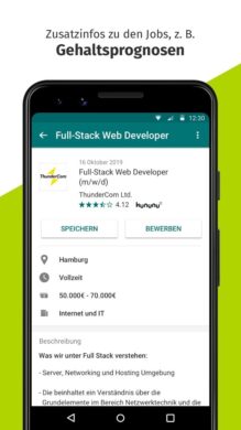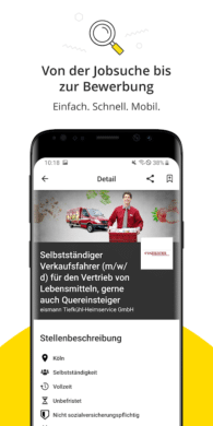 Mit StepStone reiht sich ein weiterer Big Player in unsere Top-Liste der besten Job-Apps für Android ein. Der Klassiker unter den Online-Jobportalen ermöglicht es Dir, auch Deinen Traumjob zu finden. Und die Auswahl kann sich dabei sehen lassen. So gibt es bei StepStone über 80.000 Stellenangebote. Da man bei so vielen unterschiedlichen Stellenangeboten schnell den Überblick verlieren kann, bietet Dir die App praktische Filtermöglichkeiten an. In Kombination zu passendenden Schlagwörtern findest auch Du Deinen maßgeschneiderten Traumjob. Solltest Du Dir noch nicht sicher sein, kannst Du ein Job-Angebot völlig unkompliziert auf Deiner Merkliste gewissermaßen zwischenspeichern. Wenn Du zu einem späteren Zeitpunkt unzweifelhaftes Interesse hast, ist die Bewerbung völlig unkompliziert. So ermöglicht Dir StepStone einen bequemen Upload Deiner relevanten Bewerbungsunterlagen. Der praktische Job-Alert sorgt dafür, dass Du Stellenangebote, die zu Dir passen, garantiert nicht mehr verpasst.