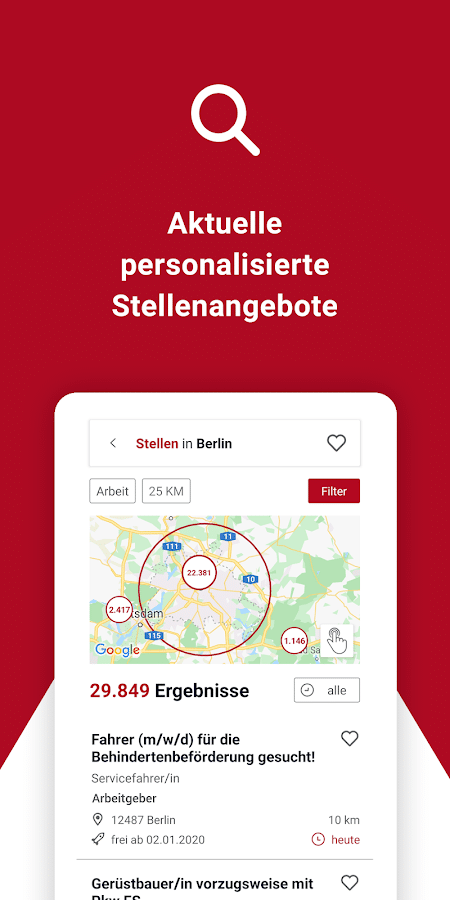 Wer früher auf der Suche nach einem passenden Job war, kam um einen persönlichen Besuch des Arbeitsamtes unter Umständen nicht herum. Diesen umständlichen Schritt kann man sich nun zum Glück sparen. Schließlich hat die Behörde aufgerüstet. Die Bundesagentur für Arbeit unterstützt Dich nun auch in Form einer Job-App namens Jobsuche bei der Suche der passenden freien Stelle. Diese App möchte vor allem mit einer guten Übersicht punkten. Und das gelingt ihr. Obwohl hier über 1 Million unterschiedliche Jobs gelistet sind, kann man schnell und einfach die passende Stelle finden. Dabei bietet Deutschlands größtes Job-Portal die passende Stelle für jedermann. Egal, ob Du nach Arbeit, Ausbildung, Praktikum oder Arbeit als Selbstständiger suchst. Bei der Jobsuche wirst Du durch die Unterstützung der Bundesagentur für Arbeit garantiert fündig. Dank der übersichtlichen Karte kannst Du außerdem einsehen, wo die zu Dir passende Stelle zu finden ist. Wer bereits weiß, wo er oder sie gerne arbeiten möchte, kann dies selbstverständlich auch in den Suchkriterien festlegen.