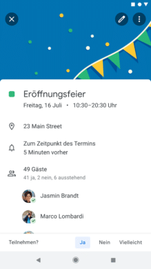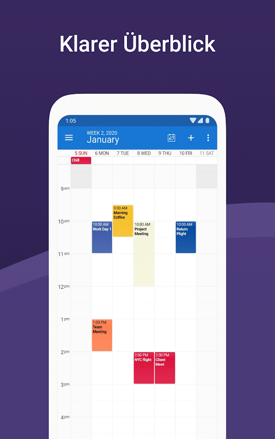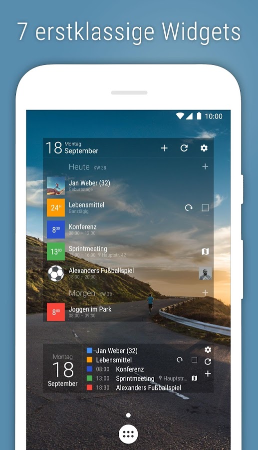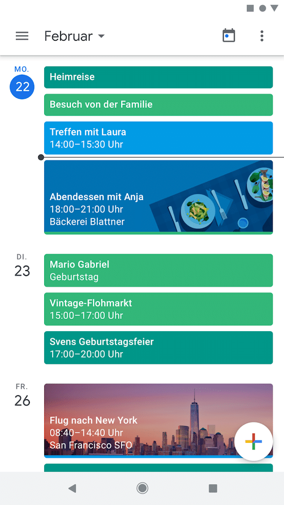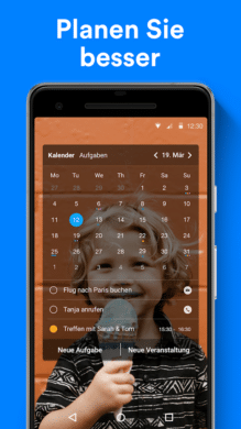 Ab Werk bietet jedes Android-Gerät Googles hauseigene Kalender-App. Wie wir es von dem Internet-Giganten nicht anders kennen, verbindet Google hier das Google-Konto perfekt mit einem praktischen und übersichtlichen Kalender. Besonders praktisch ist Googles Kalender dann, wenn man es als Widget direkt auf den Homescreen setzt. Damit kannst Du bequem durch Deine Termine scrollen, die am Tag anstehen.