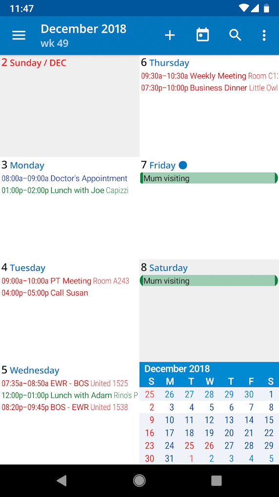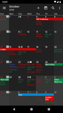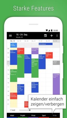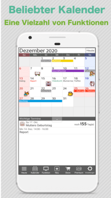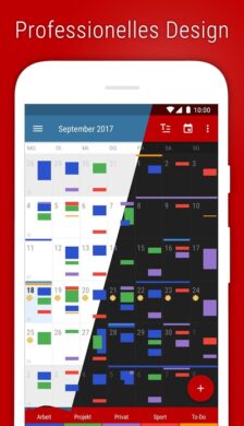 Wer einen großen Wert auf Optik und Style legt, ist bei der Kalender-App A-Calendar möglicherweise fehl am Platze. Wen das aber nicht stört, der erhält hier eine funktionale und übersichtliche App, die einige praktische Features mitbringt. So kann man beispielsweise in der Tages- bzw. Wochenansicht immer auch die Monatsansicht erkennen. Dies sorgt dafür, dass man nicht immer zwischen den einzelnen Anzeigen wechseln muss, sondern alles im Blick hat. Darüber hinaus bietet A-Calendar auch unterschiedliche Widgets, die sich sehr gut und übersichtlich in den Homescreen einfügen lassen.