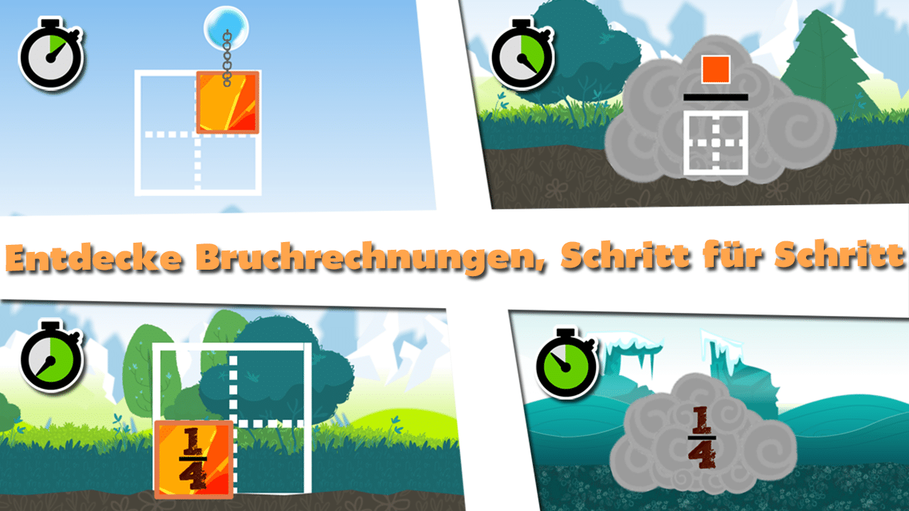 In Slice Fractions schlüpfst Du in klassischer Zeitreise-Manier in die Haut eines Mammuts. Dieses sucht sich seinen Weg durch die verschiedensten Landschaften. Doch selbiger ist nicht leicht für das Felltier mit Rüssel. Mit der Unterstützung Deines Kindes muss es Level für Level Rätsel lösen, um voranzukommen. Um die störenden Blöcke aus Eis oder Lava neutralisieren zu können, muss man bspw. herausfordernde Aufgaben aus dem Bereich der Bruchrechnung bewältigen. Wenn man in einem Level Eis und Lava gegenseitig neutralisiert hat, kann es weitergehen. Doch hier können nicht nur Brüche trainiert werden. Dein Kind lernt auch Grundlegendes zur Physik. Dies macht Slice Fractions zu einem kniffligen Vergnügen, das vor allem Kindern mit Hang zu Naturwissenschaften Spaß bereiten wird.