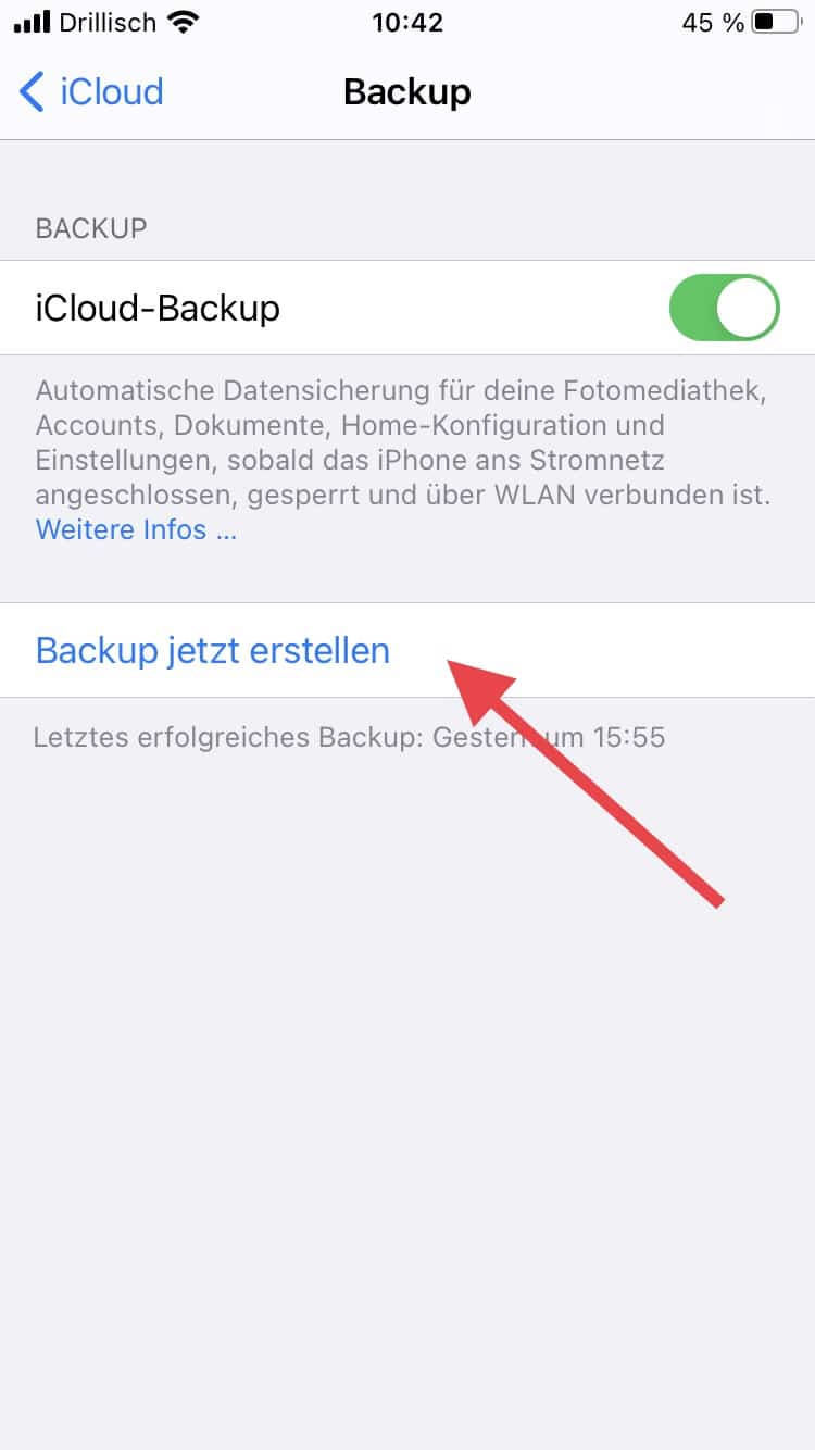 Der praktischste Weg ist wohl das Backup per iCloud. Hier machst Du Dir Apples praktischen Cloud-Service zu Nutze. Wenn Du ein Backup auf diese Weise durchführen möchtest, gehst Du zunächst in „Einstellungen“. Hier klickst Du oben auf „Apple-ID, iCloud, Medien & Käufe“. Anschließend klickst Du auf iCloud. Nun tippst Du auf iCloud-Backup. Auf der nächsten Seite entscheidest Du Dich für „Backup jetzt erstellen“. Nun erstellst Du ein nagelneues Backup in Deiner persönlichen iCloud. Stelle sicher, dass Du während des gesamten Vorgangs mit dem WLAN verbunden bist.