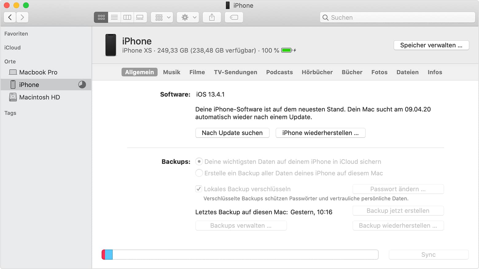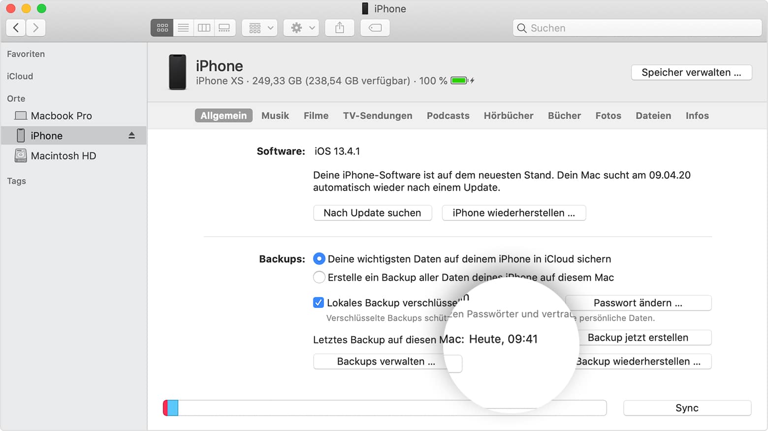 In iTunes wirfst Du nun einen Blick auf den linken Reiter „Orte“. Hier müsstest Du Dein iPhone nun finden können. Klicke dieses an und wähle den Punkt „Allgemein“ aus. Nun kannst Du Dich zwischen einem unverschlüsselten und einem verschlüsseltem Backup entscheiden. Wir empfehlen Dir, dies je nach Empfindlichkeit der Daten zu handhaben. Solltest Du „Gesundheits- und Aktivitätsdaten“ ebenfalls im Backup speichern wollen, raten wir Dir dringend zu einem verschlüsselten Backup. Ansonsten genügt ein klassisches Backup.