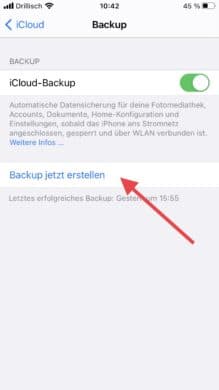 Bequemer ist selbstverständlich der Weg über die drahtlose iCloud. Für diesen Service benötigst Du nicht einmal Deinen Mac oder PC. Alles, was Du brauchst, sind Deine beiden iPhones und ein drahtloses Netzwerk. Schon kann es losgehen. Öffne zunächst die Einstellungen und wähle oben „Apple-ID, iCloud, Medien & Käufe“ aus. Hier tippst Du nun auf iCloud. Wähle anschließend iCloud-Backup aus. Auf dem nächsten Bildschirm tippst Du auf „Backup jetzt erstellen“. Dein Smartphone erstellt nun ein Backup in Deiner iCloud.
