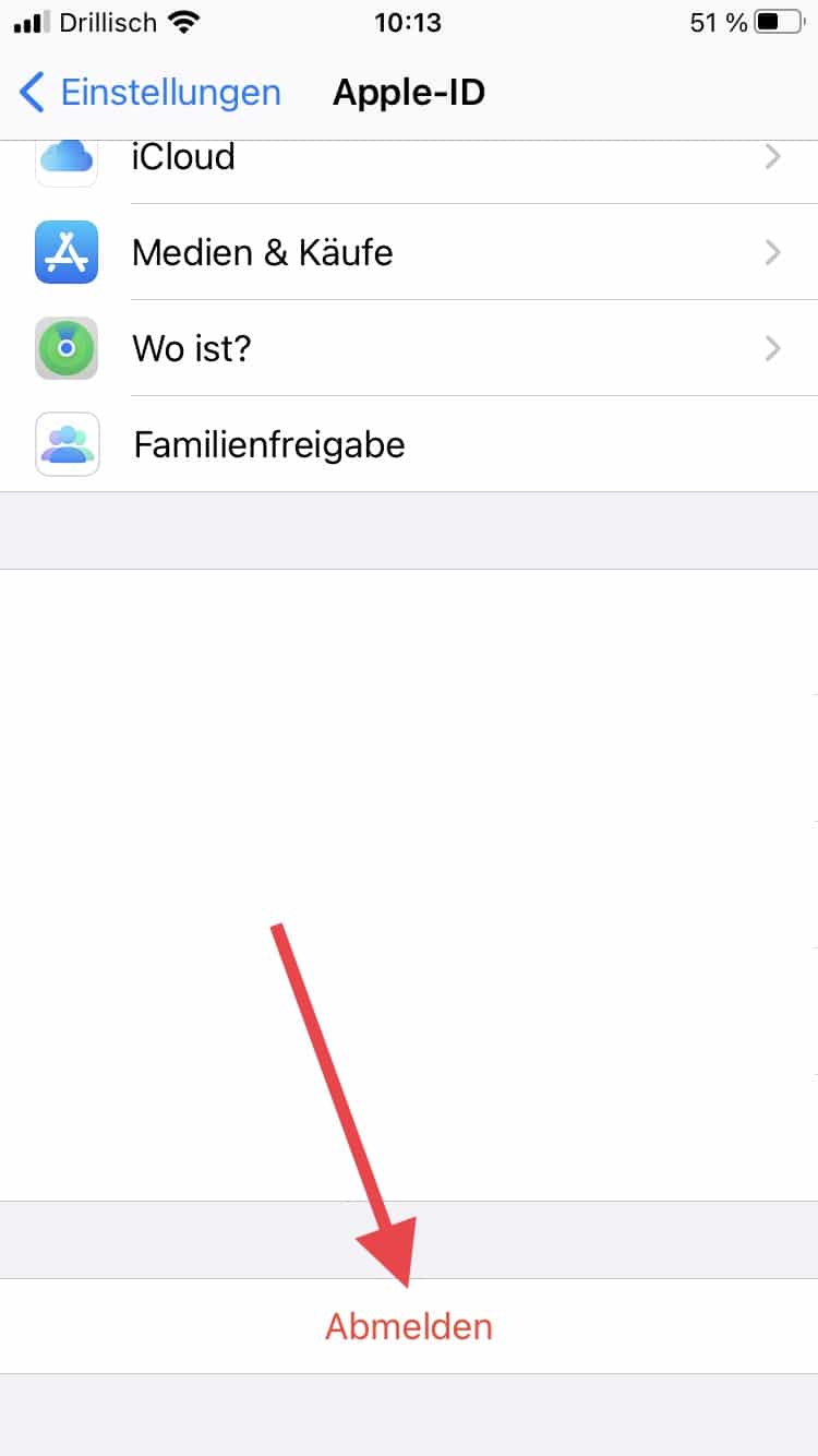 Des weiteren ist es wichtig, dass Du Dich von persönlichen Diensten abmeldest. Am wichtigsten ist dabei wohl die Abmeldung von der iCloud. Dies hat große Bedeutung, denn ansonsten drohen schwerwiegende Konsequenzen. So kann es zur kompletten Löschung Deiner iCloud kommen, wenn Du Dich vor einem Zurücksetzen nicht von selbiger abmeldest. Gehe hierfür wieder in die Einstellungen. Anschließend klickst Du wieder auf „Apple-ID, iCloud, Medien & Käufe“. Hier scrollst Du ganz nach unten und klickst auf „Abmelden“.
